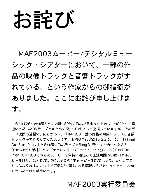 ・・・ということで、まだ原因も対策も闇の中ですが、ここまでの経験則から、少なくとも僕としては、今後の DVでのデータ募集について、以下のような条件を付けようと決めました。これは次回のICの中村先生も参考に していただければ幸いです。 次回のMAF2004は、NIME04を中核に据えて、2004年5月末から6月上旬に開催予定ですが、 ここでは以下の条件でムービーシアターを募集したいと思います。 ●DVテープでの作品応募についての条件 公演に際して、多数の作品をまとめてDVD化して上演する予定ですが、DVからDVDの変換において、音ズレなどの トラブルが起きることが報告されています。そこで、以下の条件を指定しますので対応して下さい。 (1)DV記録は以下のようなモードに設定する ・SPモード (LPモードは駄目) ・16ビット音声 (12ビットは駄目) ・48KHz音声 (32KHzは駄目) (2)コンピュータからDVにデータを書き出すためのムービー作成する際に、以下のモードを設定する ・NTSC DV ・DVストリーム形式 ・48KHzオーディオ (3)可能であれば、作品の冒頭と末尾のそれぞれに、このようなパートを置くことを強く推奨する。 これは作品としては編集の際にカットするが、これによりキャプチャ作業において、映像と音声とがずれていないこと (作品の冒頭での映像と音声の一致、最後になっても一致していることの確認)が確実にチェックできる。