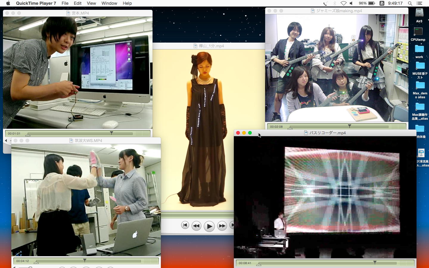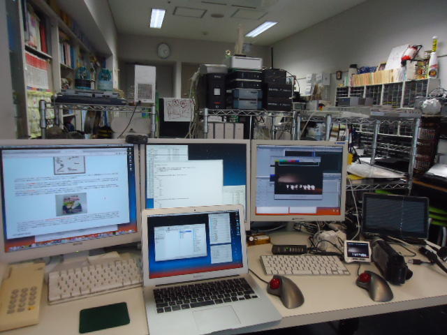 碧風祭の最終日である。 ずっと前からこの日曜日は「雨」と予報されていてその通りに朝から雨、さらに航空自衛隊浜松基地のエアフェスタがあり、静大の学園祭もあるという事で、予想通りの静かな碧風祭になった。 昨夜はメディア4回生の宮本さんと藤田さんと「内定祝勝会」として飲み食べ歌いして満足したのでクルマでSUACに出て来た。 午前はイメチェン豊島が新婚三浦を69手で撃沈させる将棋を見ていて終わり、午後にはメディア造形企画ステージを記録して、研究室に戻って 下のように記録ムービーをMPEG4に変換して過ごした。
