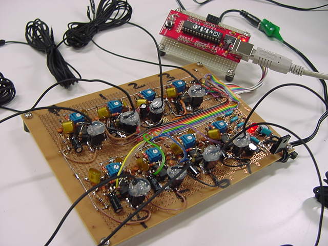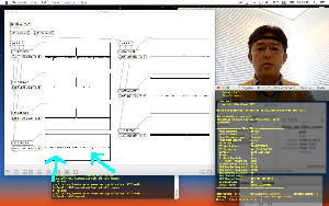全般的になんとなく大人しい今年の碧風祭の初日の模様は こんな感じ であるが、その合間には、ちょっと思い付いた実験を研究室で進めた。 上がその画面であり、画面左側の3段のグラフは3次元加速度センサ(首振り検出)なので、当面は関係ない。 中央に縦に4段、並んでいるのが、脳波の4チャンネルの信号であるが、安定した脳波信号波形に比べて、表情を動かしたりした時のアーティファクトのレベルがとても大きいために、「scale」オブジェクトで変動幅を圧縮して、グラフの縦軸の「-1.0〜+1.0」の範囲で振り切れないようにしている。