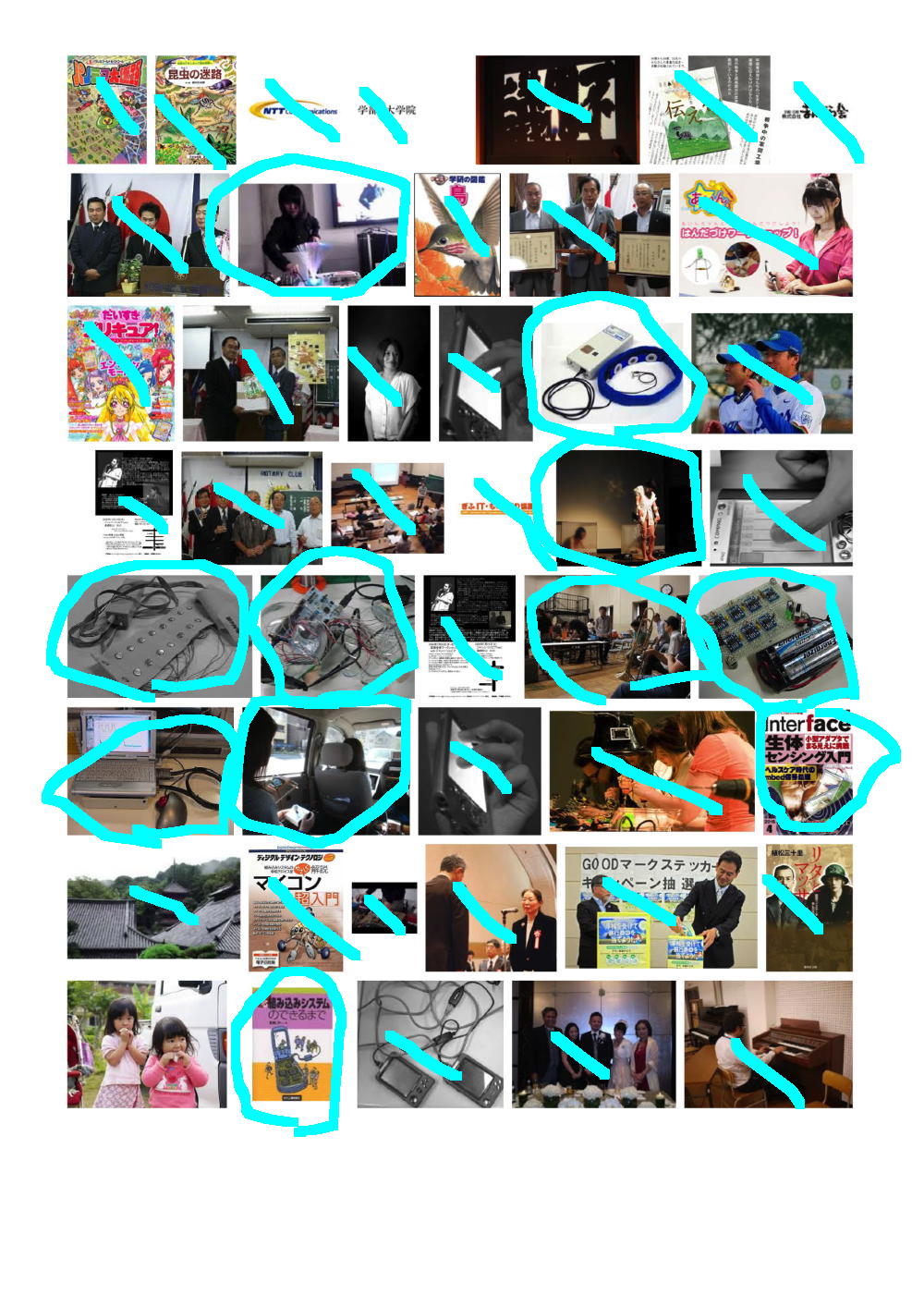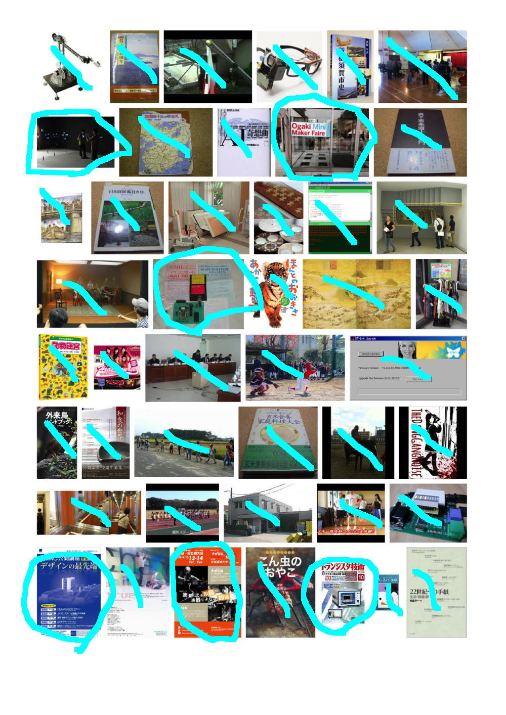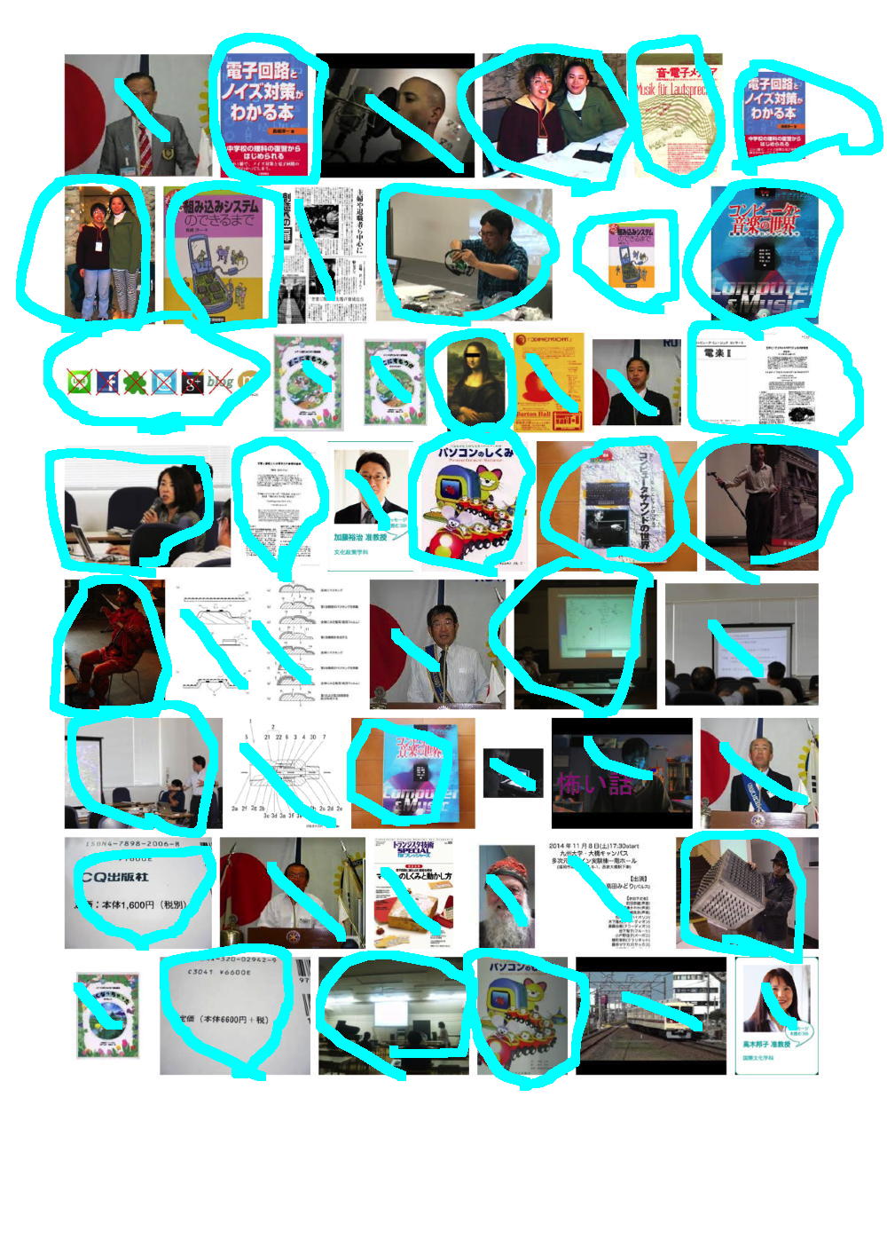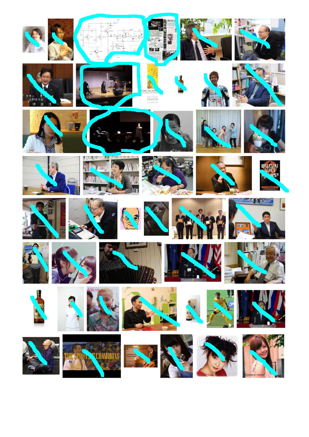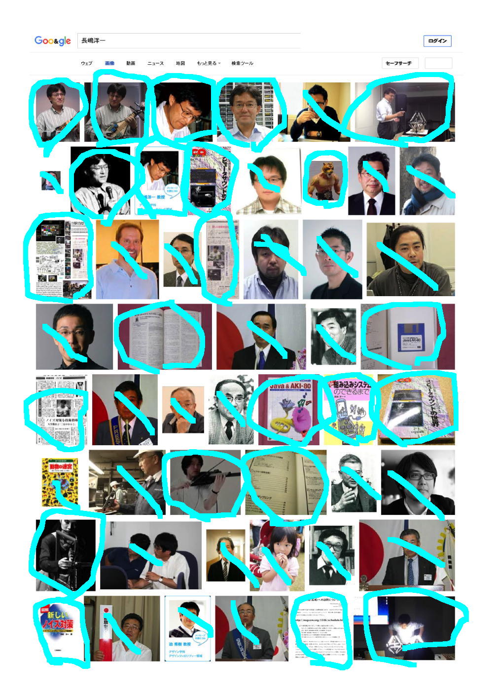 そこで、これまで行ったことの無かったGoogle画像検索に行き、試しに「長嶋洋一」と検索してみると、いろいろ僕のサイトにある画像が出て来た。 上にあるのはその最初の9ページであり、僕のサイトにあるか、または別のサイトにあるものの間違いなく僕であるものにマルを付けてみると、けっこうたくさんあるものの、まったく関係ない画像もたくさんあった。