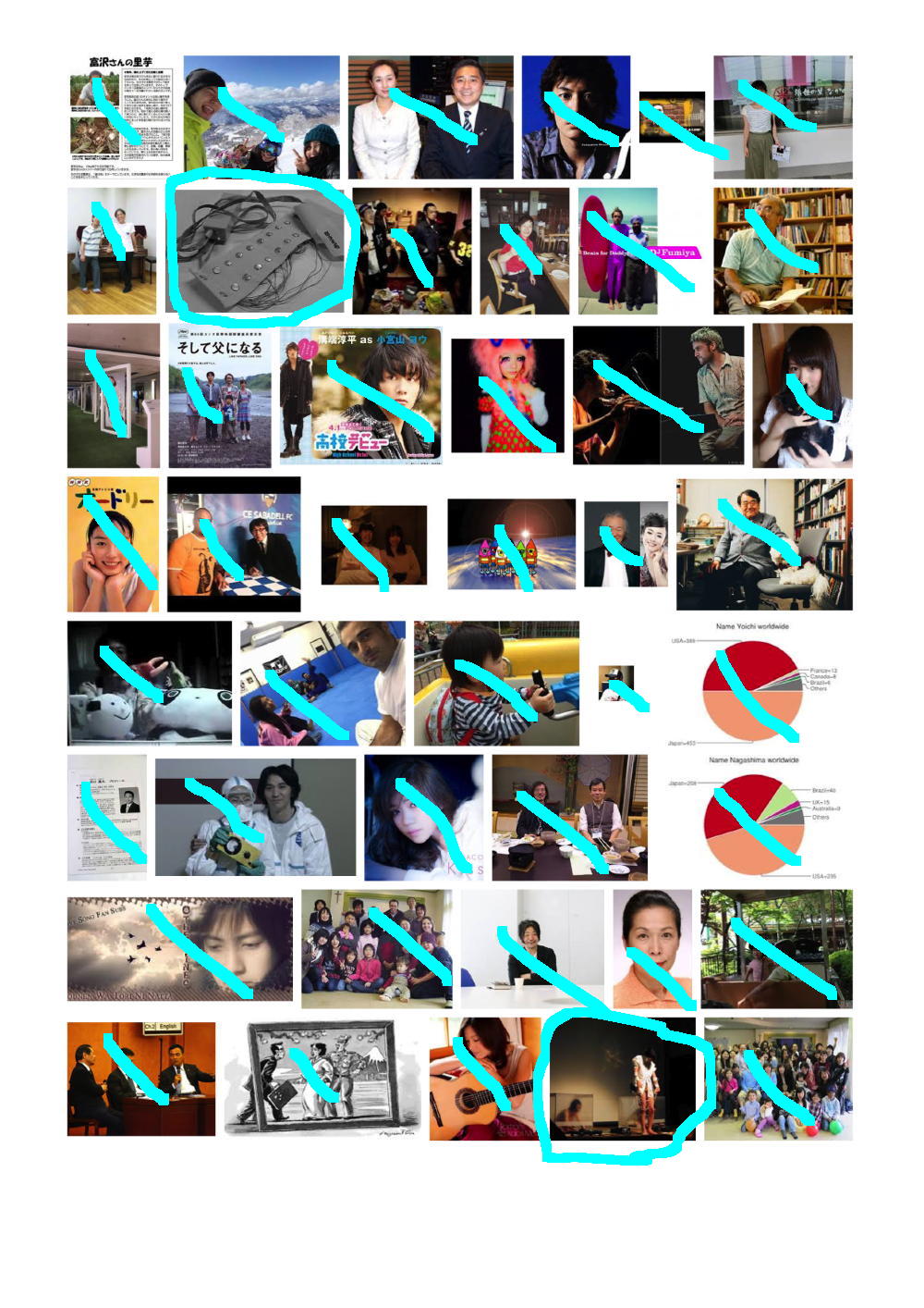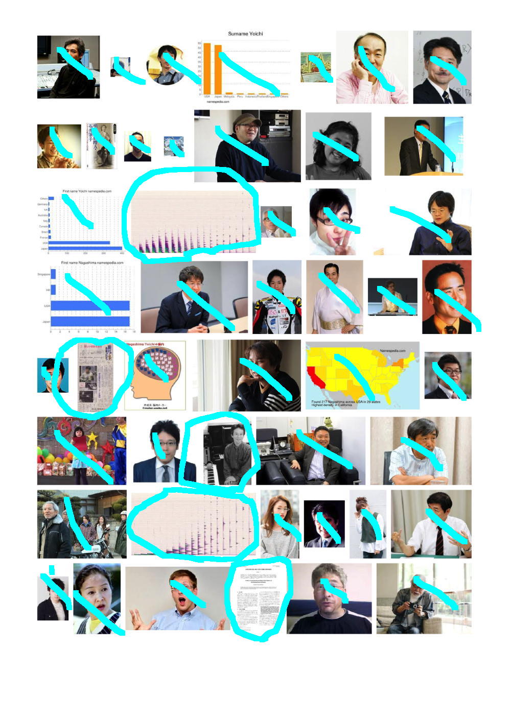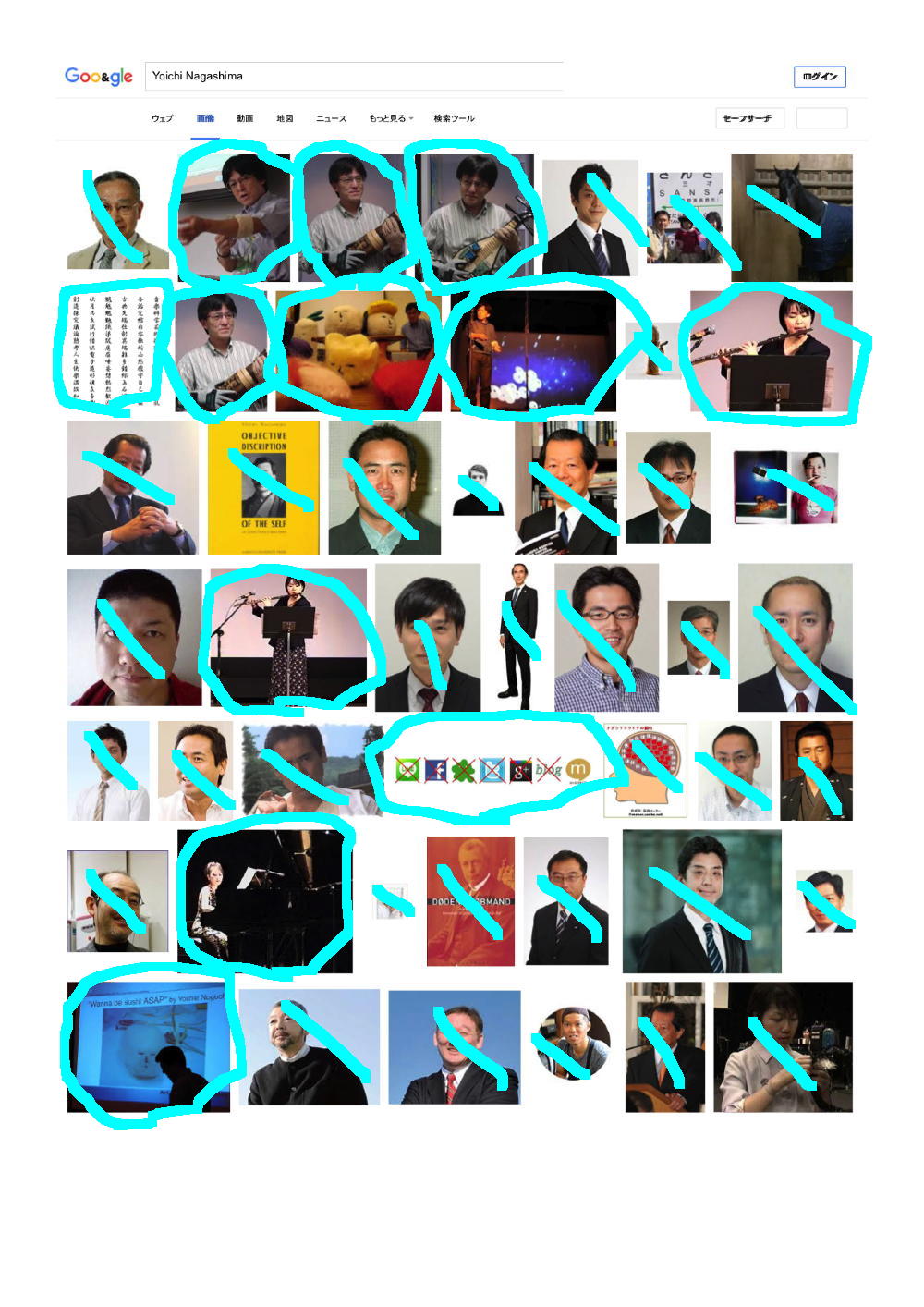 そして上は、「Yoichi Nagashima」と検索してみて出て来た最初の9ページである。 同様に僕のサイトにあるか、または別のサイトにあるものの間違いなく僕であるものにマルを付けてみると、けっこうたくさんあるものの、まったく関係ない画像もたくさんあった。 つまり例えば、悪意をもって、ある人の名前でGoogle検索して、その直前とか直後に「見たくもない画像」を検索表示して・・・というのを何人もで何度となく繰り返せば、その人の名前でGoogle画像検索した結果のトップに「見たくもない画像」がたくさん並ぶ、というのは簡単なのである。 これはGoogleの仕様であり、まったく関与することの出来ない、困った状態なのだ。 対策は簡単であり、「Googleなんて使わない」「Google検索結果なんて気にしない」、つまりはこれまでと同じあれば、僕は安心なのである。(^_^;)