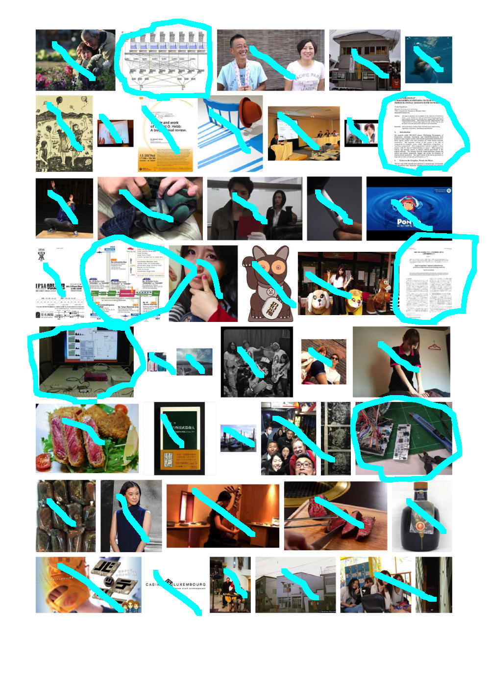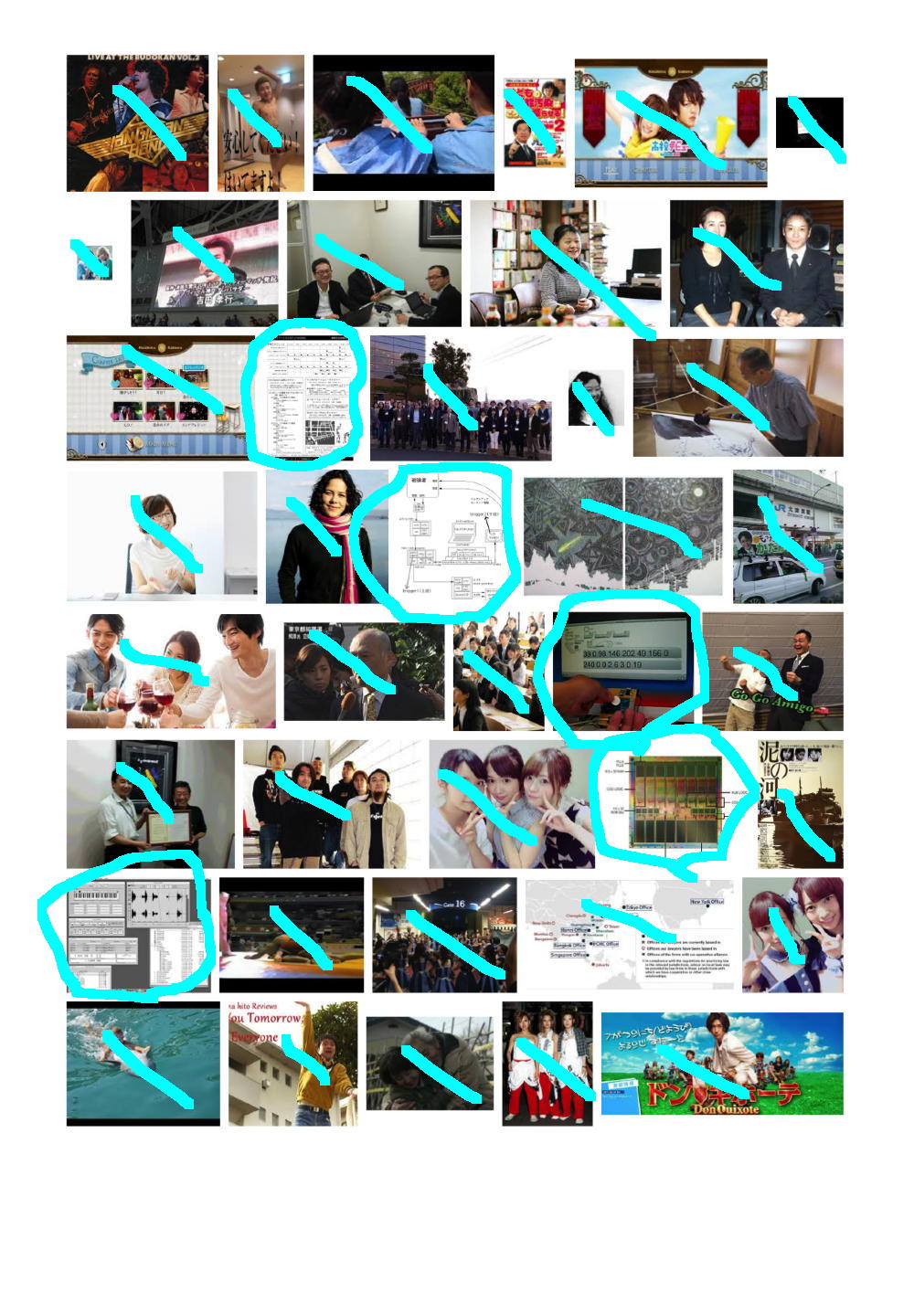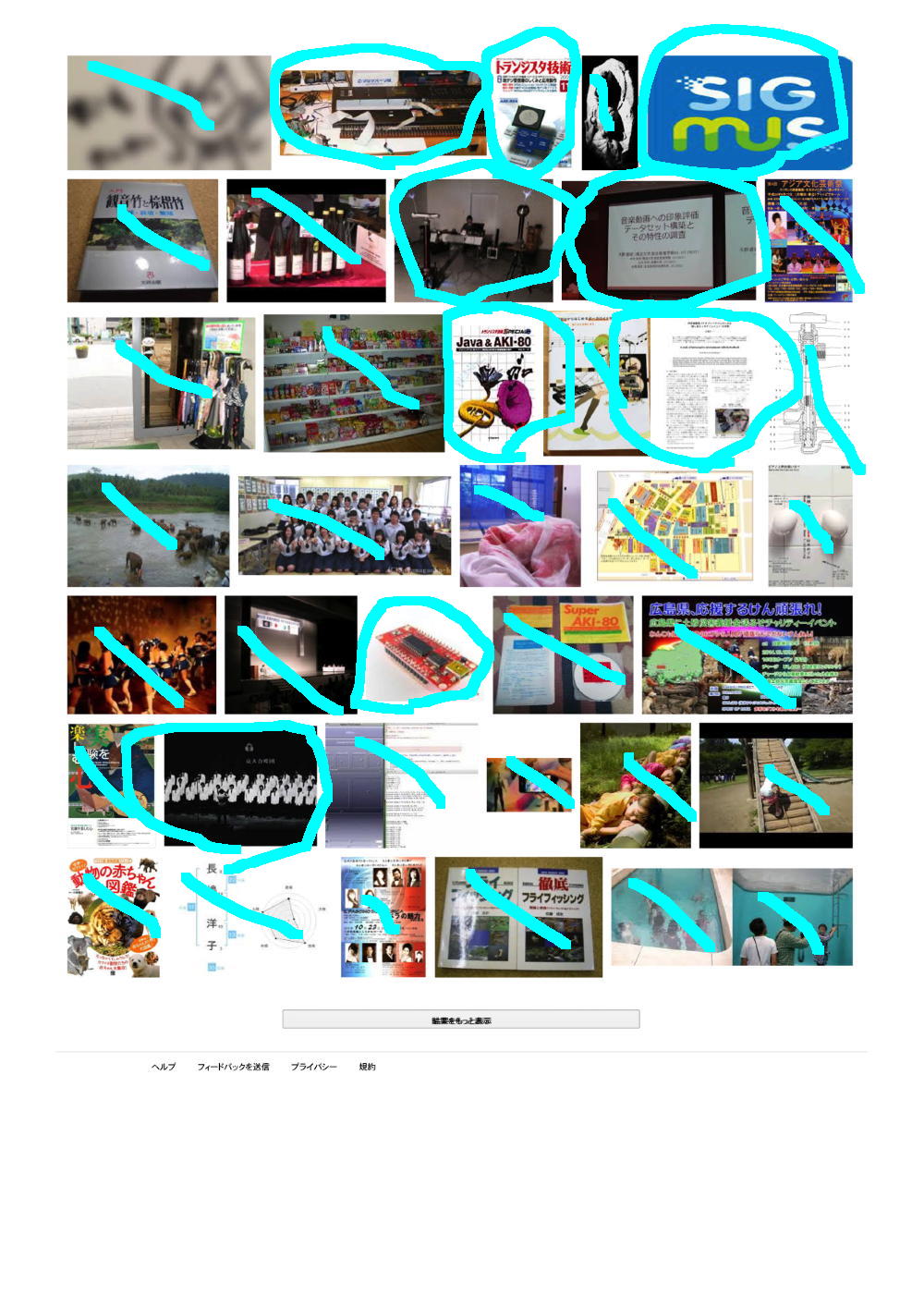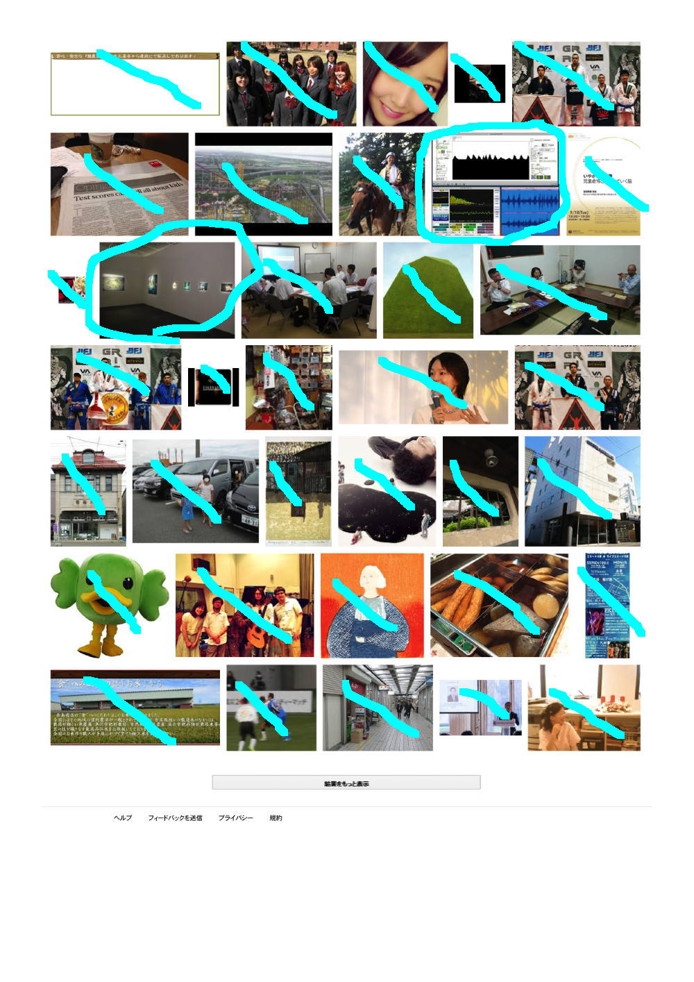 そして上は、「Yoichi Nagashima」と検索してみて出て来た最初の9ページである。 同様に僕のサイトにあるか、または別のサイトにあるものの間違いなく僕であるものにマルを付けてみると、けっこうたくさんあるものの、まったく関係ない画像もたくさんあった。 つまり例えば、悪意をもって、ある人の名前でGoogle検索して、その直前とか直後に「見たくもない画像」を検索表示して・・・というのを何人もで何度となく繰り返せば、その人の名前でGoogle画像検索した結果のトップに「見たくもない画像」がたくさん並ぶ、というのは簡単なのである。 これはGoogleの仕様であり、まったく関与することの出来ない、困った状態なのだ。 対策は簡単であり、「Googleなんて使わない」「Google検索結果なんて気にしない」、つまりはこれまでと同じあれば、僕は安心なのである。(^_^;)