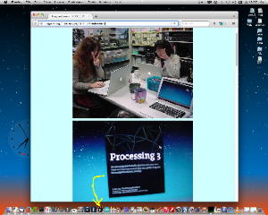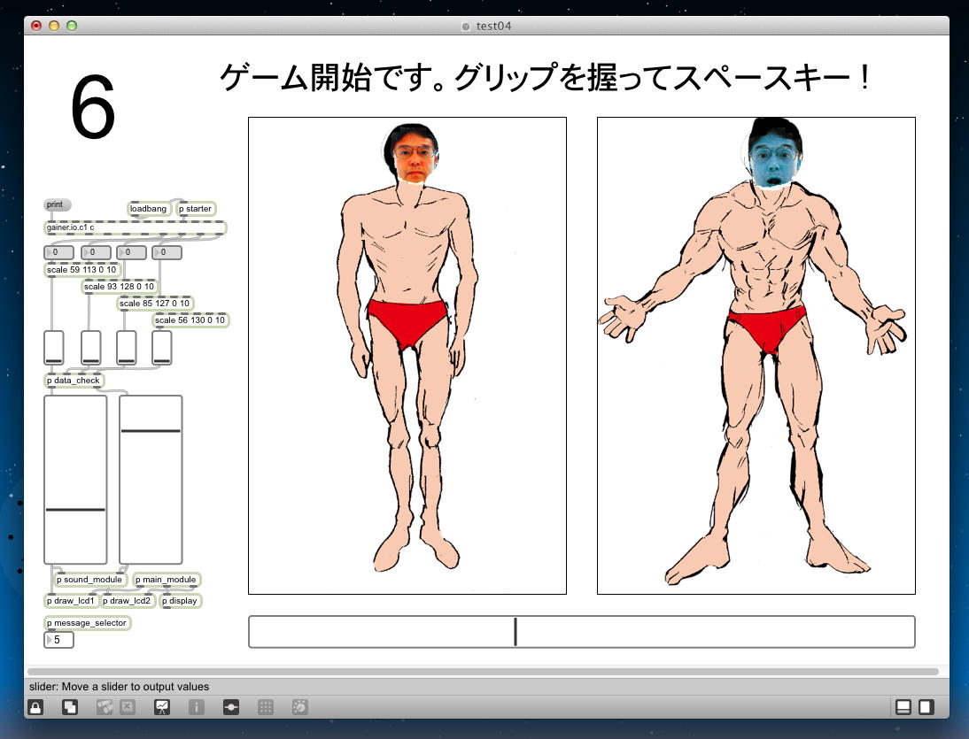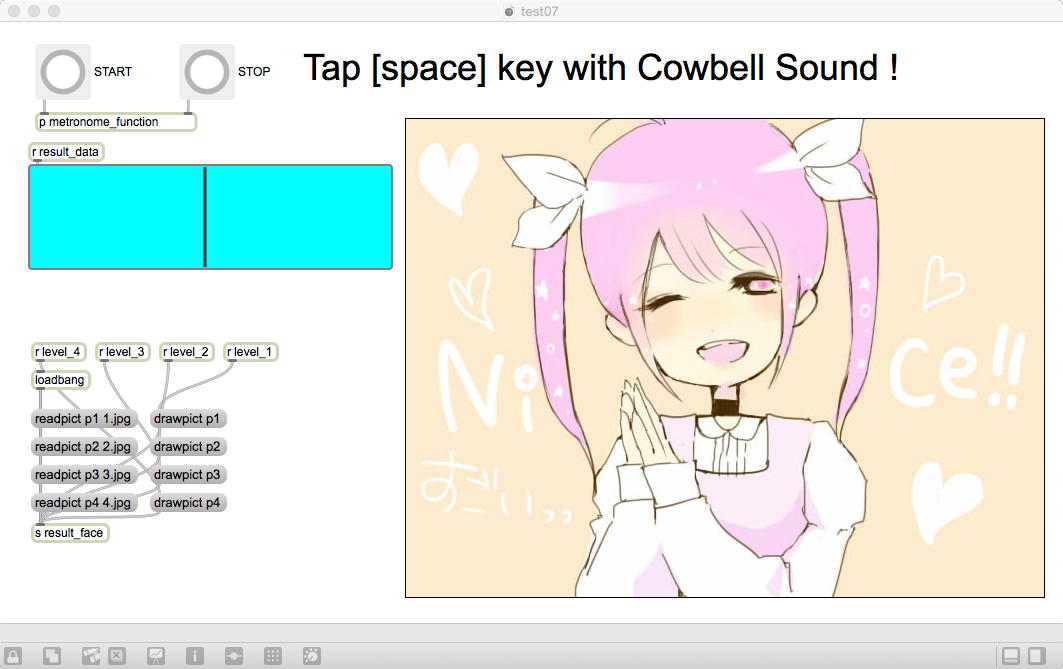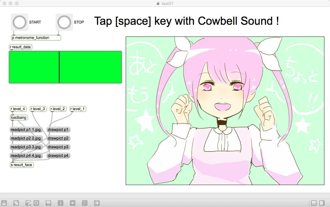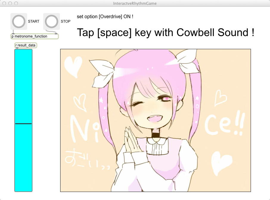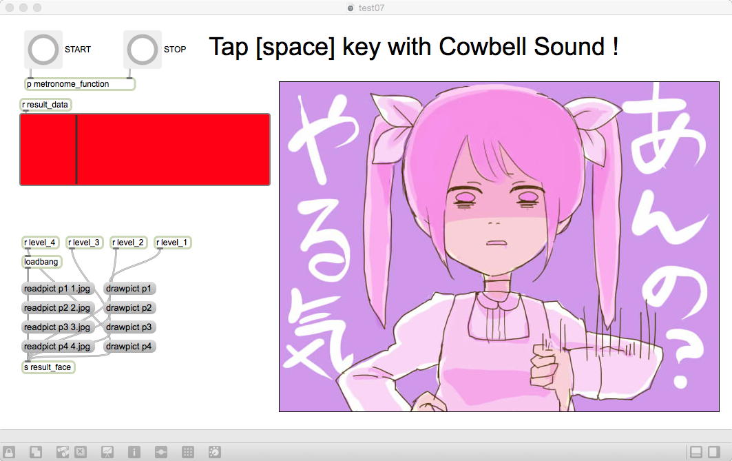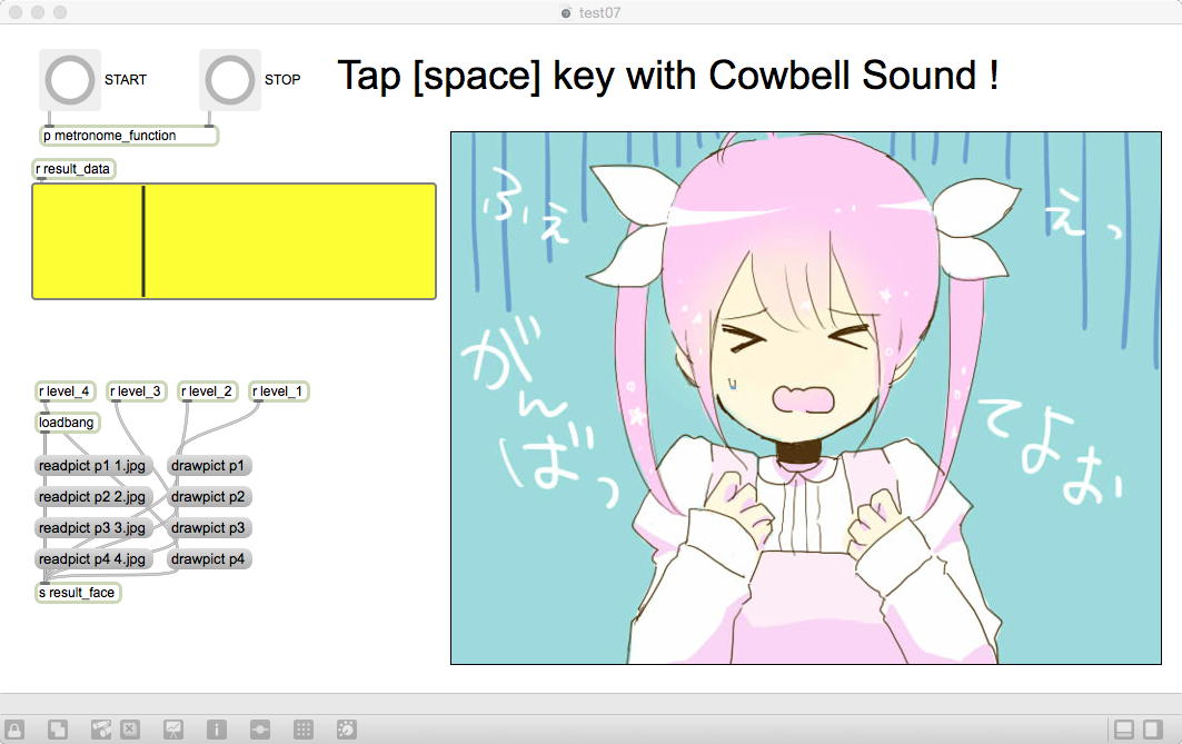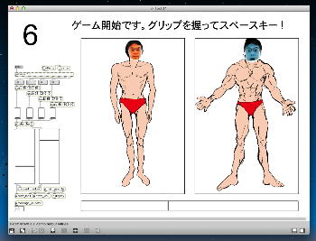 昨日の祝日はアカペラの有志とマラソンカラオケ大会→焼肉パーティ、という盛り上がりの休日となり、今日はゼミの日である。 2限〜3限のゼミは このように 盛り上がり、石井さんが前回のゼミでサクサクと描いてくれた可愛いイラストによって完成したインタラクティブ・リズムゲームは以下のようになった。