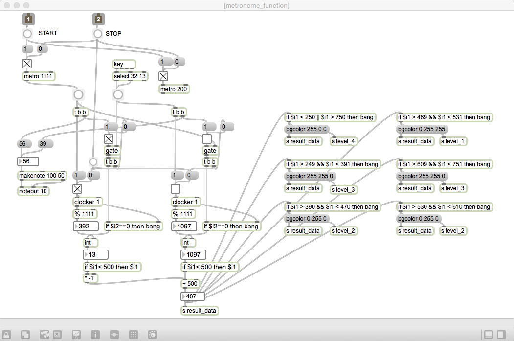 上のように、画面をちょっとスッキリさせてみた。 注意点としては画面内に書いたように、オプションの「Overdrive」を必ずONに(チェックを入れた状態に)する事である。 これをしないと、テンポがもたったりタイミング判定の誤差が増えて使い物にならなくなる。 そして、来年の2月末に、関西でpart2の「Maxでバイオフィードバックのツールを作ろう」セミナーを開催する、という方向に話が進んできた。音楽情報科学研究会が3月初旬に相愛大学で開催されるので、ここに発表参加すれば一石二鳥と、いろいろ繋がってきた(^_^)。