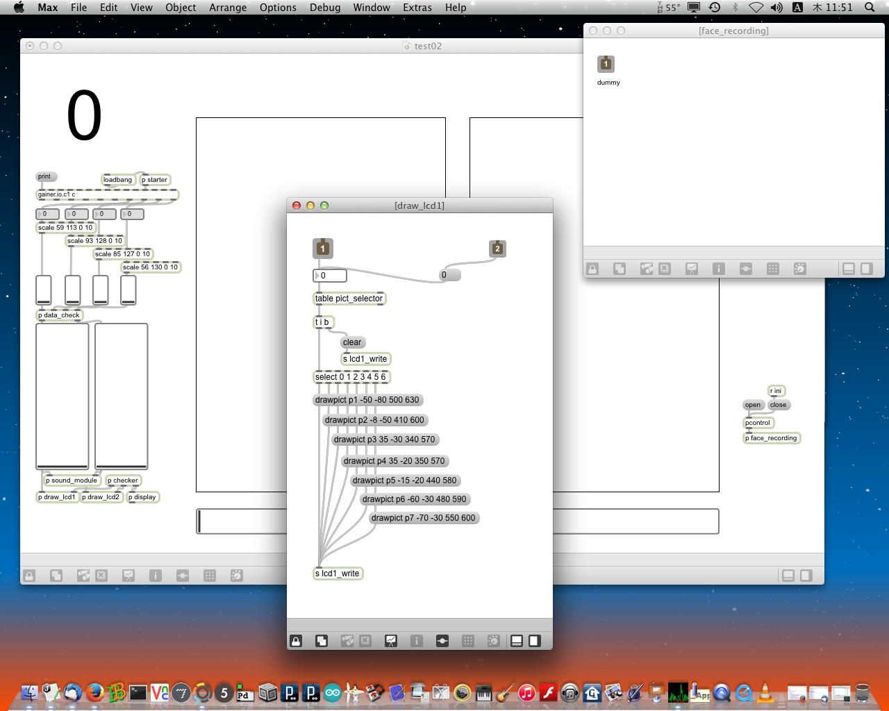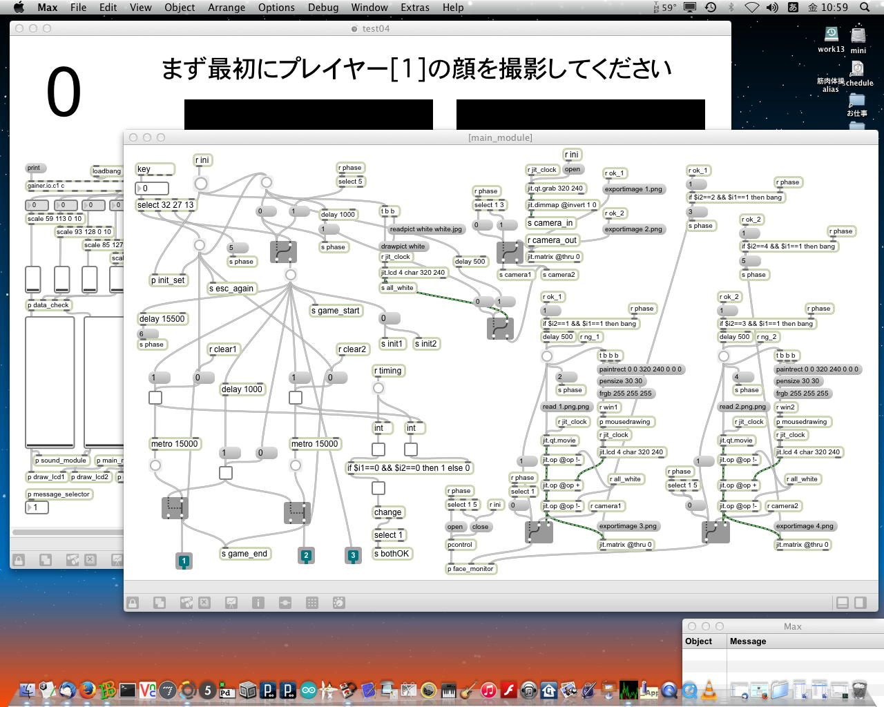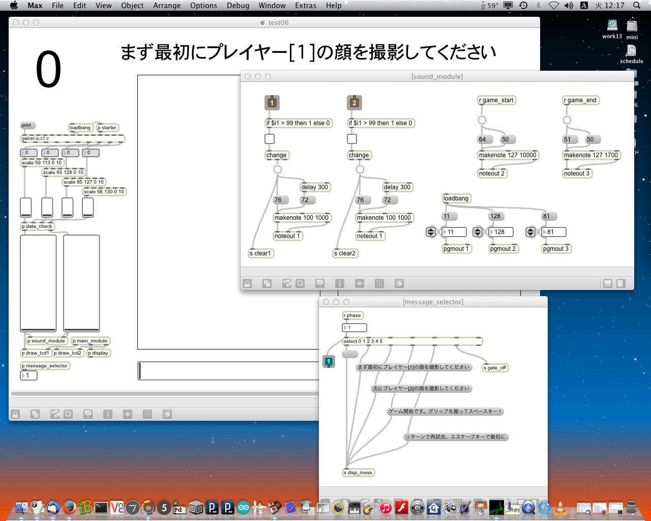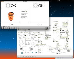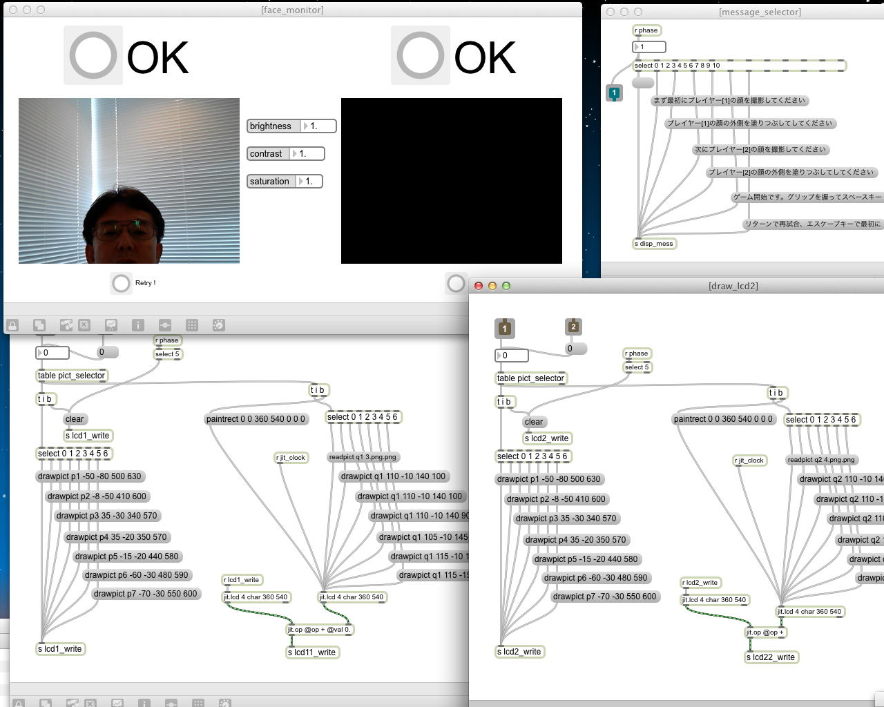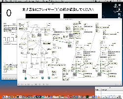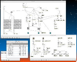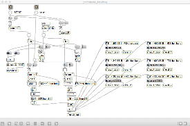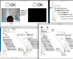 ・・・しかし11時にマルチメディア室からMacがギャラリーに移動したものの、段取りの悪さが露呈してきた。 現場の設置も不明、ということで研究室に戻ったが、これでは先が思いやられる(^_^;)。 その後、14時にギャラリーの仮設置が出来たのを受けて、6台のiMacのIPアドレスを手入力で固定に設定して、LANハブによって6台をclosed接続して、かつての「おはなしパネル」のMaxパッチから簡単に改造した、以下のような こんなパッチ を入れて、作業は完了した。 準備の全体の風景は こんな感じ である。「ヵッォ ぉゃっ ょ-」 …ぉゃっ ぃぃ… 「ぇぇ- ぉぃιぃ ぉヵヵ ょ?」 ぉヵヵ? …ぁゃιぃ ゎぁ… ぃゃゃゎぁ… ぉヵヵ ぉぃιぃ… ιょぅゅぁι゛ぃぃゎぁ… 「ヵッォ ぉヵヵ ぉぃιぃ?」 ぉぃιぃょ-