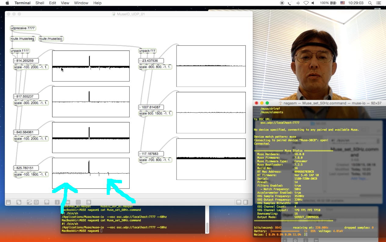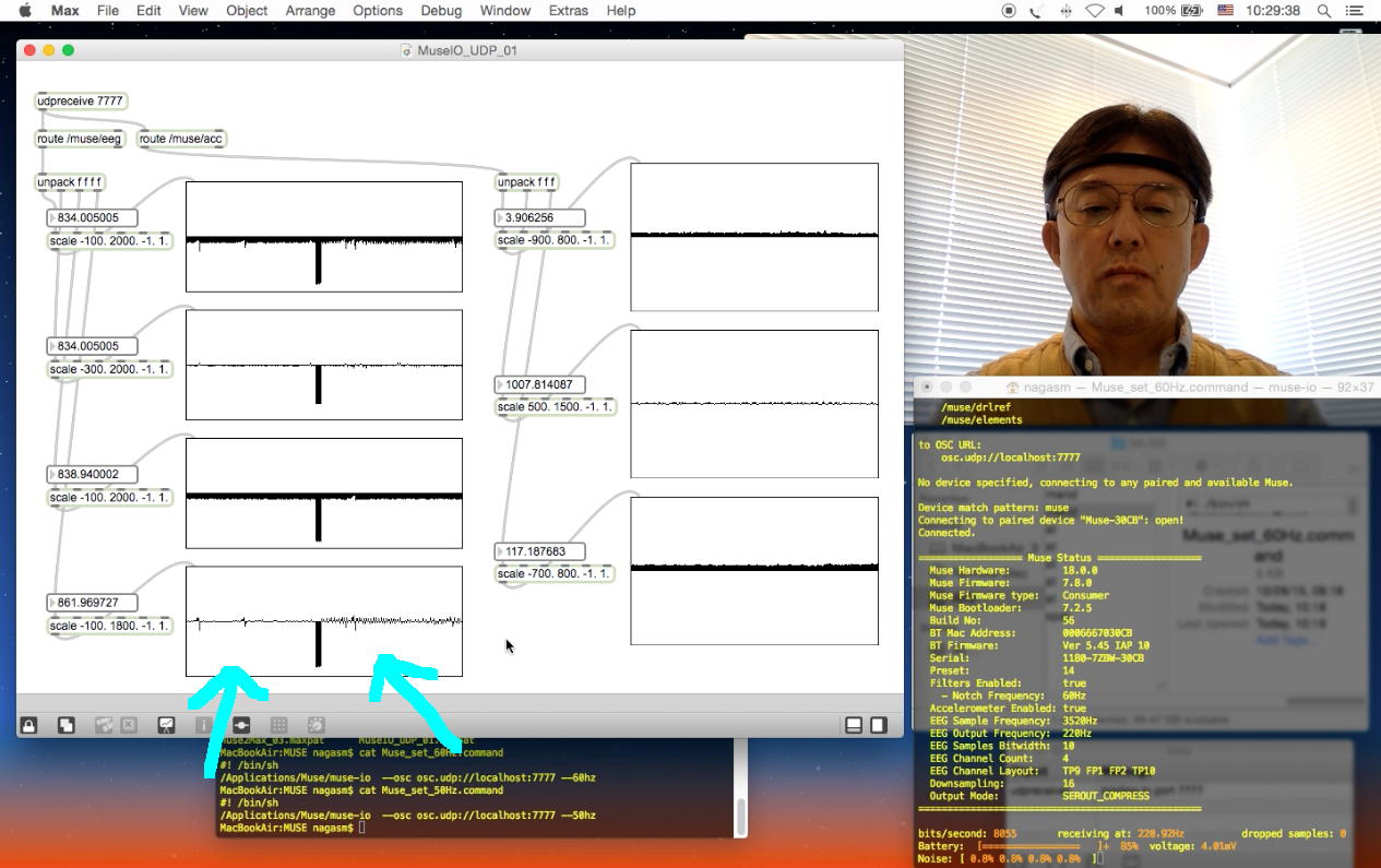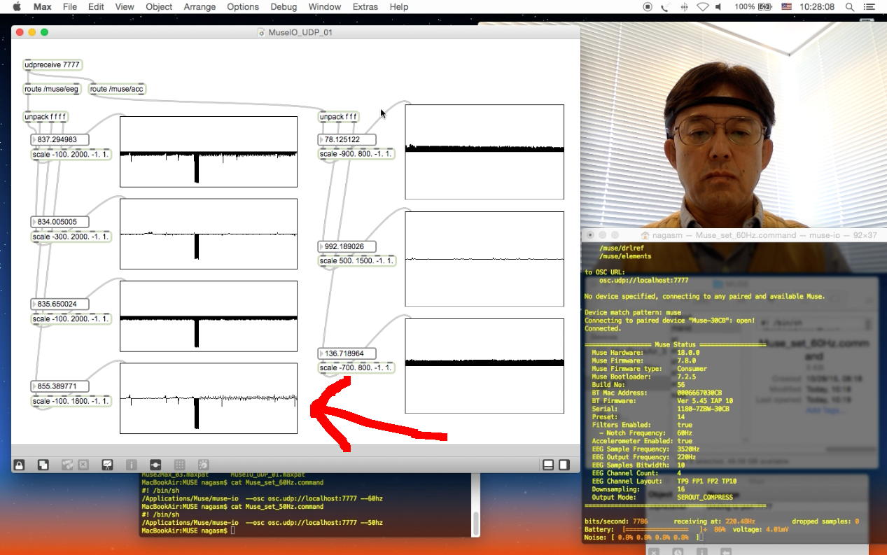 上のMax画面の左側の4段の脳波データは、それぞれ「TP9」・「Fp1」・「Fp2」・「TP10」の電極位置に対応しているのか、それとも「シータ波」・「アルファ波」・「ベータ波」・「ガンマ波」のFFT結果に対応しているのかまだ理解しきれていないのだが、矢印の脳波のところに、60Hzと50Hzとの違いが顕著に現れたので、もしかするとここは後者の「ガンマ波」(30Hz〜50Hz)なのかもしれない。 上の例では、前半のノッチフィルタが60Hz、途中でこのスクリプトを停止して、後半は50Hzのものであり、明らかに後半に電源ノイズが乗ってきている。