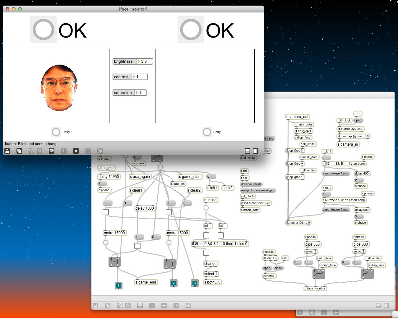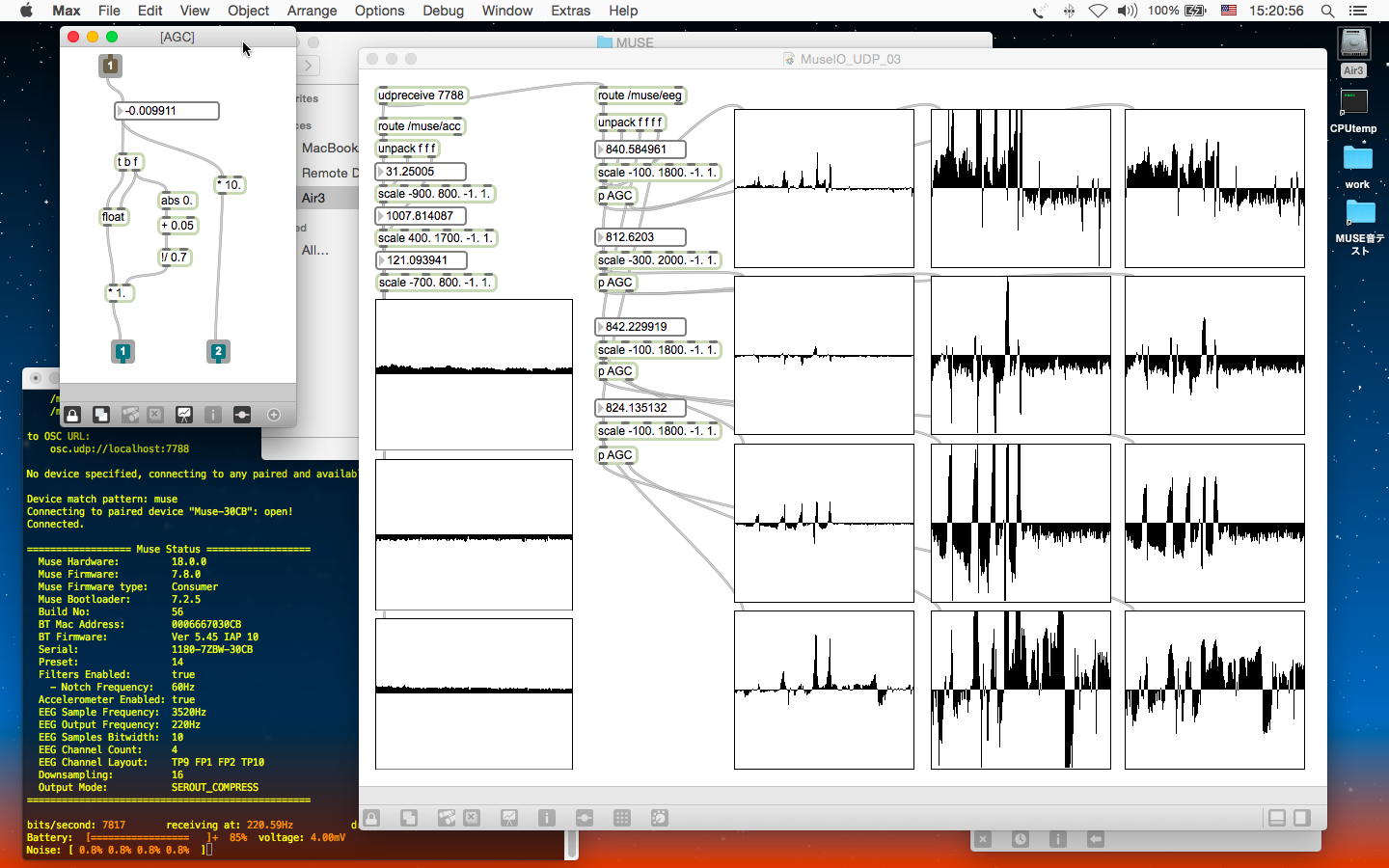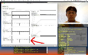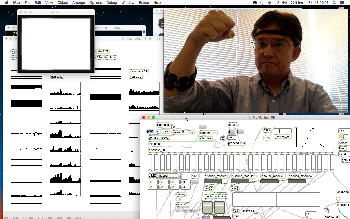 そしていちばん右に縦に4段、並んでいるグラフは、同じ変数スケールであり、さらにスクリーン左上の「AGC」というサブパッチによって、信号レベルが小さい時にはほぼ10倍アンプ、ただし信号レベルが上がるとその値に応じて強烈に圧縮する、という簡易AGCとしているので、アーティファクトの時にもフルスケールまで行かず、50%〜60%あたりまでで飽和するようになっている。 この簡単な処理によって、なんとか脳波信号と表情筋データとの両方を扱えないか・・・という発想なのである。 顔の様子とともに記録したYouTubeは以下である。