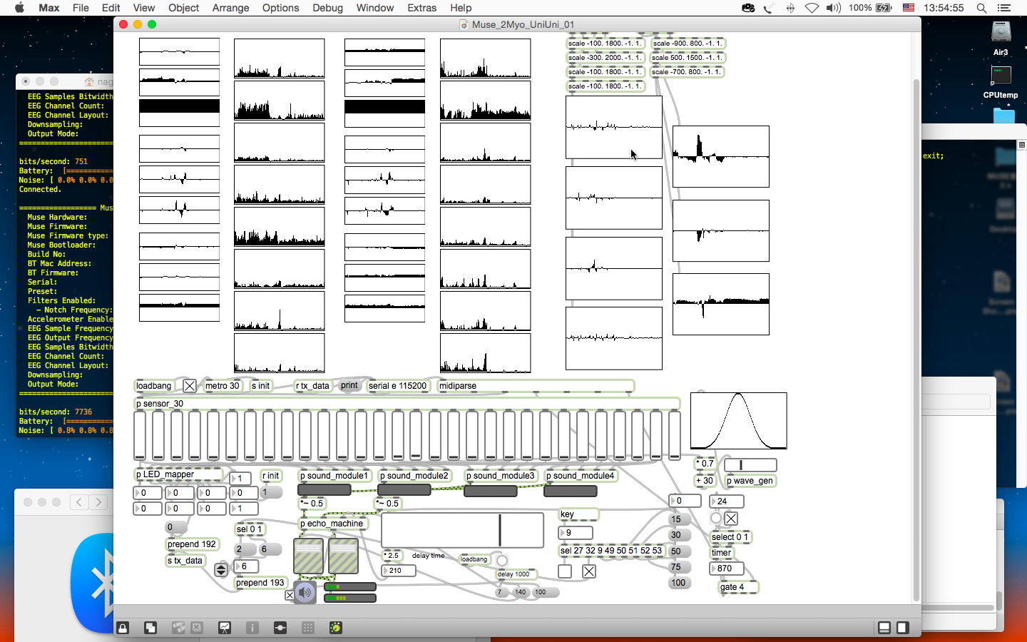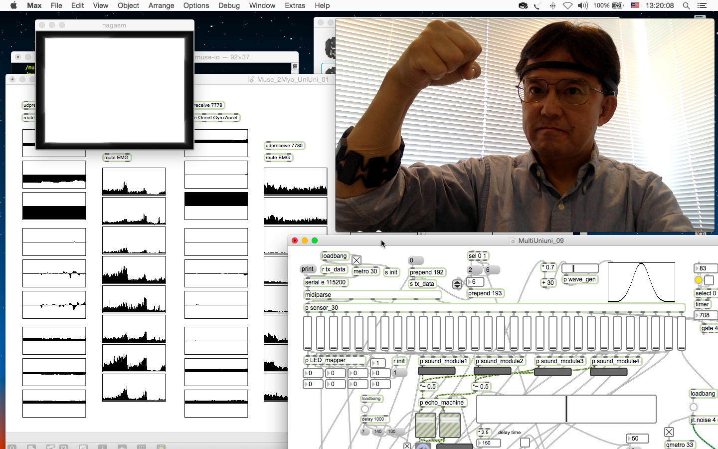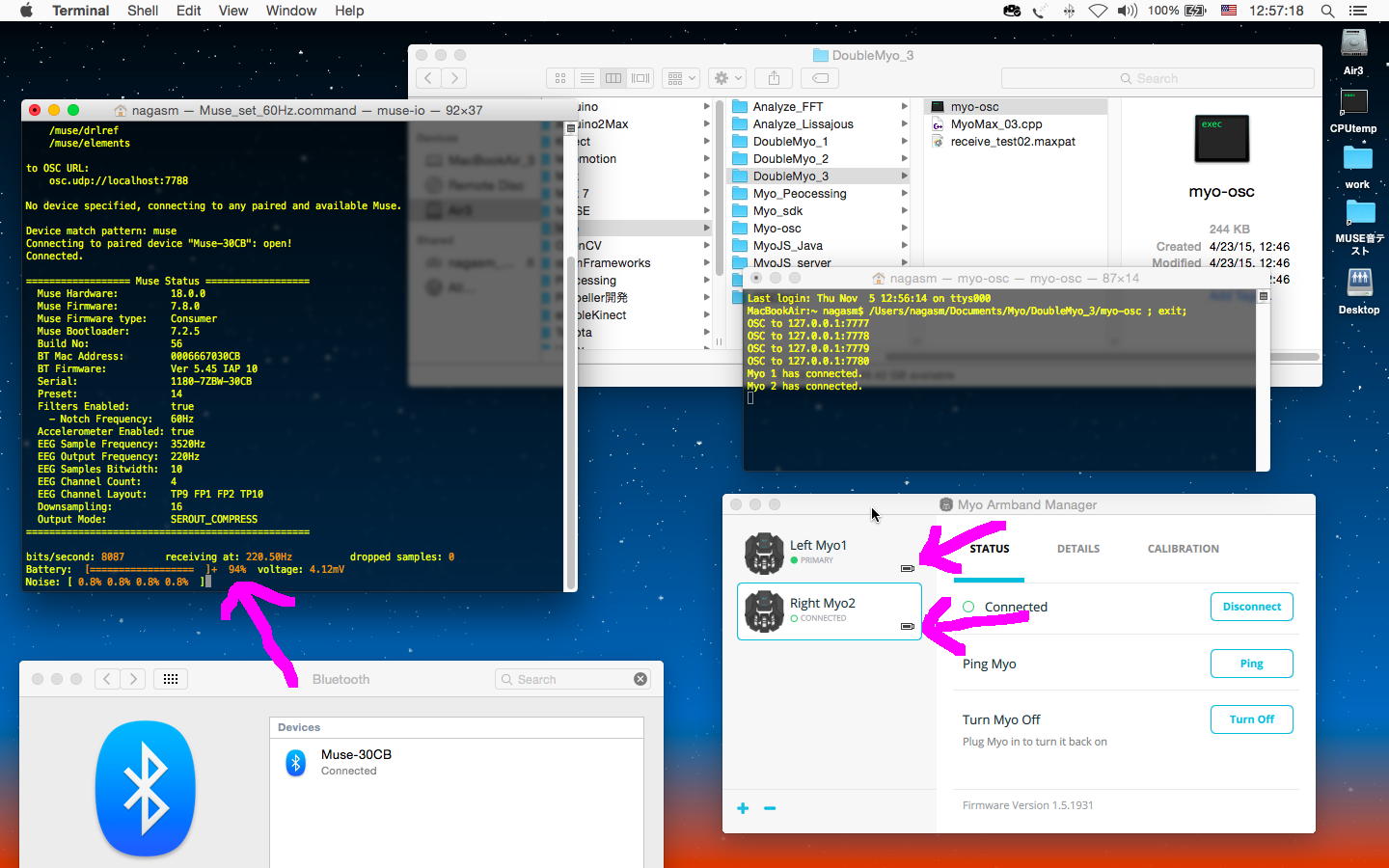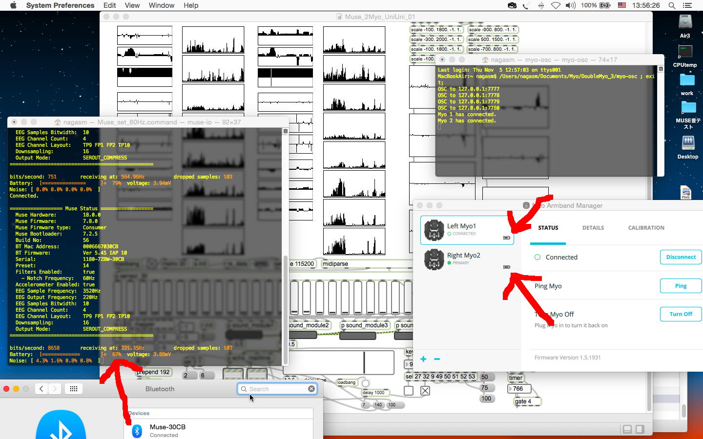 ここで昼食を挟んで、午後もマルマル空いている(碧風祭のメディア造形3回生有志企画の設置は明日の朝9時)ことを利用して、満タン充電したMUSEと2個のMyoをずっと身体に装着しつつ、さらに「お触り楽器」(MultiiUniUni)も接続して、これらのセンサ情報を統合する、という実験を行うことにした。 大きな目的としては、今後のツアーに備えて、どのくらいバッテリが連続使用に耐えるか、という測定という意味がある。 とりあえず以下のように、ほぼ13時にMUSEとMyoの動作を開始させた。 MUSEは午前中にも使っていたのでフル充電でなく「94%」であり、2個のMyoは満タンである。