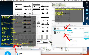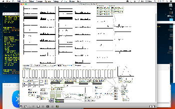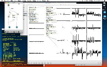 その後、さらに全てのセンサをそのまま装着してMaxパッチを走らせてBluetoothセンサ通信を続けていると、上のスクリーンショットからさらに15分後には、2個のMyoがいずれも2割〜3割は減ってきて、MUSEも「62%→61%」になってきた。 とりあえずの心証としては、「満タン充電しておけば連続90分〜2時間はほぼOK」というところだろう。 この間、Xcodeで自作した「ダブルMyo→OSC」というプログラム、さらに「MUSE→OSC」というシェルスクリプトは、それぞれのBluetooth接続が落ちることなく継続した。 Myoの方は、このHTMLをキーボードで打つ、という通常の筋電センサの動作でないために、両手のMyoがバイブで「どーなっているの??」と聞いてくるが、とにかくsleepせずに動き続けるというのが大事であり。、ライヴComputer Musicの道具(新楽器)としての条件として、重要な確認となった。