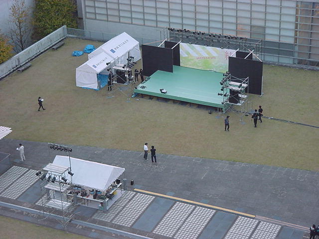 11階から出会いの広場を見下ろすと、明日の設置日を前に、碧風祭のステージが出来上がっていて、いよいよ週末は「お祭り」である。 午前から午後にあれこれ進めて疲れたので、夕方までの2時間ほどは、フト1106本棚の萩尾望都の名作2冊「11人いる」と「百億の昼と千億の夜」をじっくりと読んで過ごして、今日はオシマイである。 明日は朝9時から、マルチメディア室の買い取りMacのIPアドレスを明示的に設定して、「6台のMacでOSCによりフレーム同期させて6種類の映像を再生する」というMaxパッチをその場でアドリブでプログラミングの予定であるが、他には何も予定がないので、さらに何か、合間に進めていってみよう。