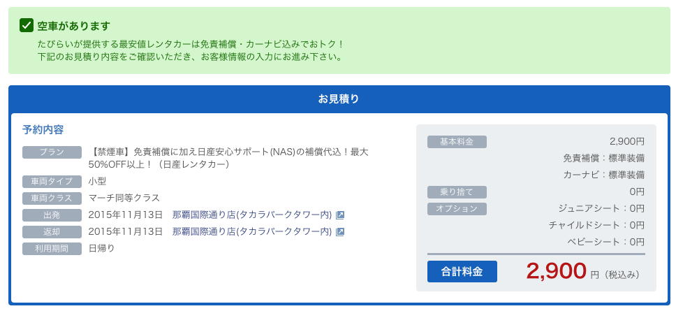 とりあえず Wikipedia とか このページ とか このページ とかから調べてみると、上のYAHOO地図とGoogle地図ではだいぶ書き方が違っているが、およそ下のような感じで、那覇からはだいぶ遠いと判明した。 バスは1日に2本程度ということなので、レンタカーを借りる可能性とバス(名護からタクシー?)の両方を検討する必要があるかな・・・と思ったが、ちょっと検索してみると「那覇〜名護」の高速バスが片道2100円もかかるという事なので、那覇で1日レンタカーを借りるのがbest、と即決して、以下のようにサッサと予約してしまった。 さすがレンタカー激戦区の沖縄、1日で2900円というのは立派である。(^_^)