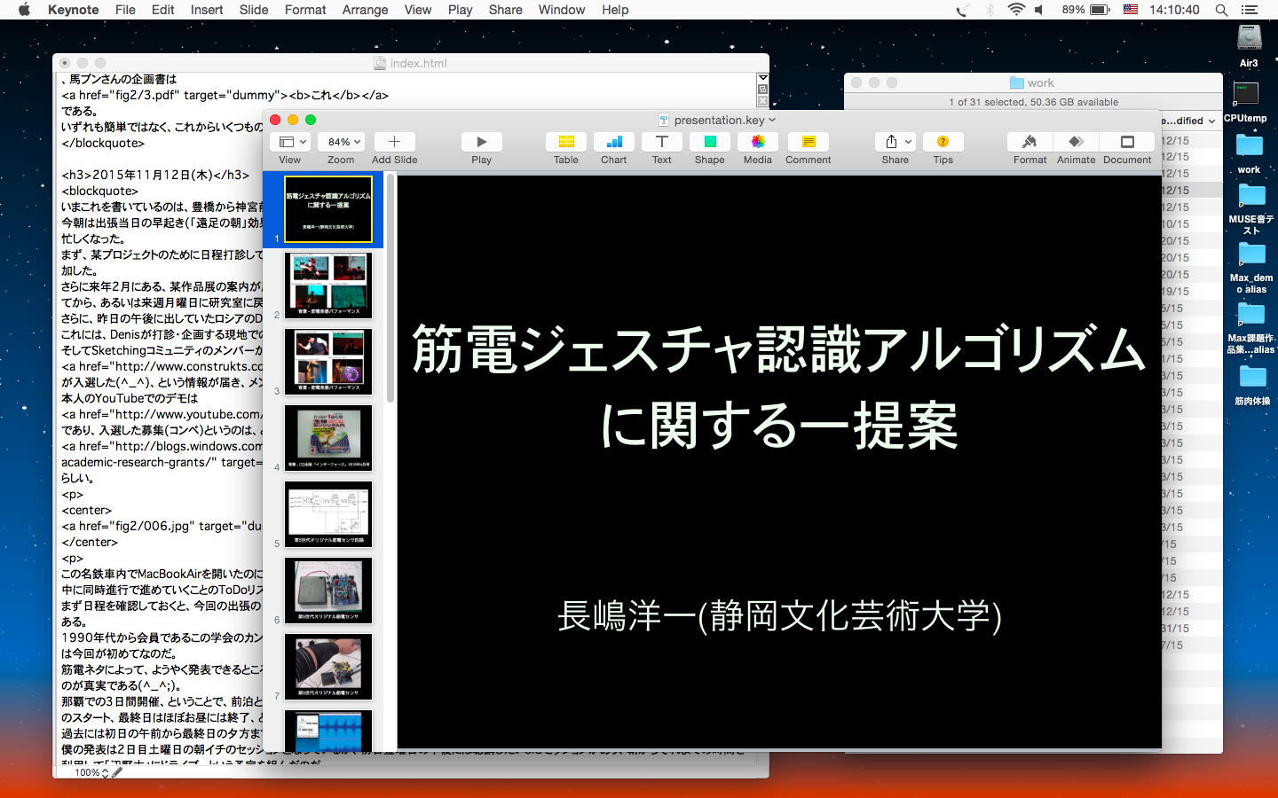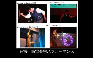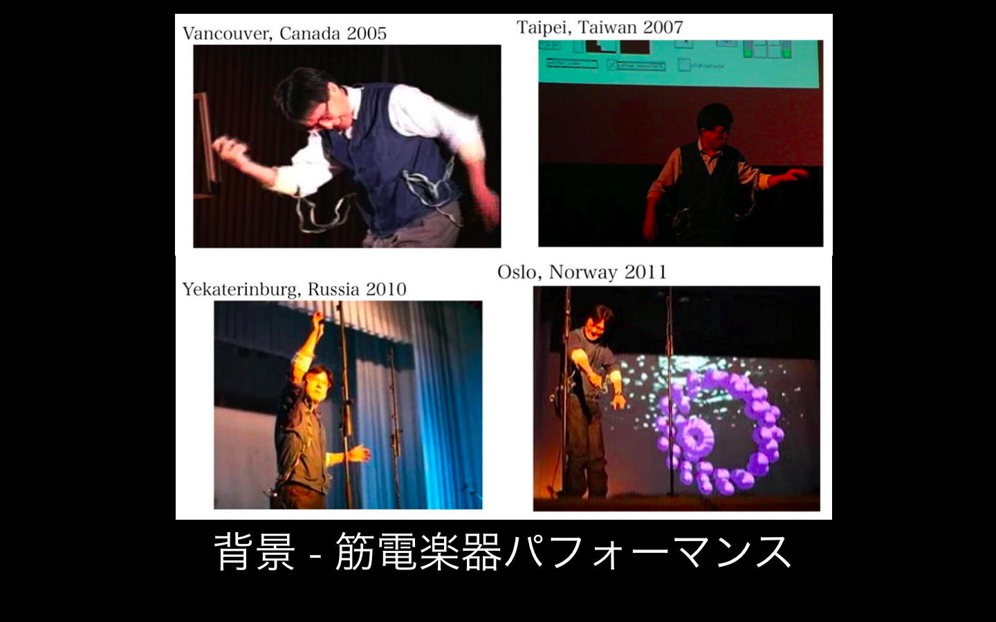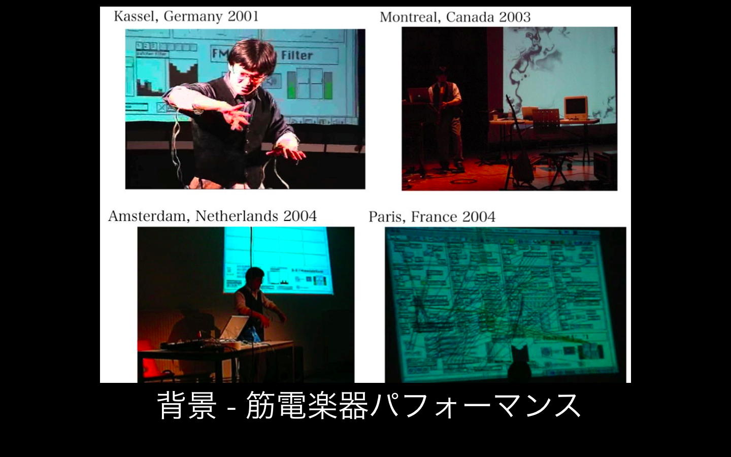 いまこれを書いているのは、朝9時半、沖縄県総合福祉センター会議室のセッション会場である。 僕は4人のセッションの4番手なので、パソコンを立ち上げての内職である。 割り当てられたセッションは「義肢装具」というところで、4件中3件が筋電ネタなので、ここに割り当てられたらしい(^_^;)。 ただし他の発表は、当然ながら福祉工学ズバリであり、「実は普段は筋電音楽やってます」と冒頭に言いにくい空気であると判明したが、せっかくなので、プレゼン冒頭の以下の2枚もチラッと見せることにした。