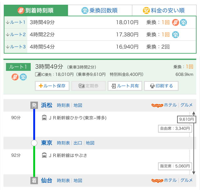 そして、気合いで発表参加申込用紙を書き上げて(後でどのようにでも解釈されるように書いたのは言うまでもない(^_^;))、一気に提出してしまった。 「参加および発表申込締切:2016年2月1日(月)」とあるので、もしかするとまた一番乗りかもしれない。 合わせて、東横インの会員専用のページから前泊と後泊の予約も完了した。 ネットで新幹線の旅費を検索すると上のように片道18,000円ほどなのに対して、ANAのサイトで「旅割75」を使うと12,000円ほどである、と判明した。 そこで予約に行ったが、往路は取れたものの、帰路は朝イチのフライトが取れなかった(午後に学科会議と教授会があるので午前中にSUACに帰りたい。取れるフライト価格は29,000円(;_;))ので、なんと特例ながら、「行きはセントレア→仙台のフライト」・「帰りは仙台→東京→浜松の新幹線」という異種混合旅程が確定した。