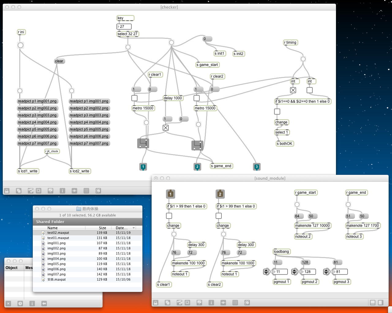 さて今日は終日、あれこれやってやろう・・・という朝に辻下先生からメイルが届き、上にあるリズムのBFゲームについては、名称のかぶりを避けて「インタラクティブ・リズムゲーム」とする事にして、YouTubeの記載も修正した。 そして、Maxのソース(Maxパッチと石井さん作の静止画4枚)版と、Macアプリケーション版について、以下のようにまとめてみた。 これは辻下先生とかリハビリ関係者にも試してもらう事になりそうである。