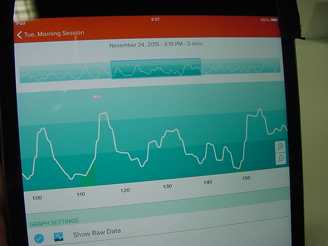 この右側に縦に4段、並んでいるグラフは、同じ変数スケールであるが、入力信号を10倍している。 その結果、脳波が平静に出ている時には波形が程よく拡大されて変化の様子が見えているが、アーティファクトの時には上下フルスケールにへばりついてリミッタがかかってしまう。(^_^;)
