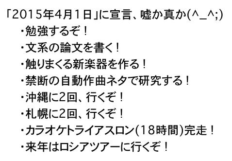 朝から照岡さんのメイルが昨日に続いて届き、辻下先生のメイルと僕のメイルがこれに絡んで、バイオフィードバック関係もあれこれ水面下で盛り上がっている。 村尾先生のプロジェクトもあり、某T○Y○T○中央研究所との共同研究も継続しそうで、ここに欧露ツアーに向けての準備、さらに水面下の某プロジェクトとあれこれ充実である。 たまたま研究室ページの整理をしていると、以下のように、ちょうど1年前、去年の4月1日には以下のようなものを置いていた。 エイプリルフールの日ということで置いたのだが、けっこう、2015年もいいセン行っていた、と判明した(^_^)。 たいていは有言実行してしまい(札幌は1回に減ったが)、出来なかったのは「カラオケトライアスロン(18時間)」ぐらいだった。