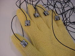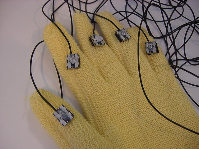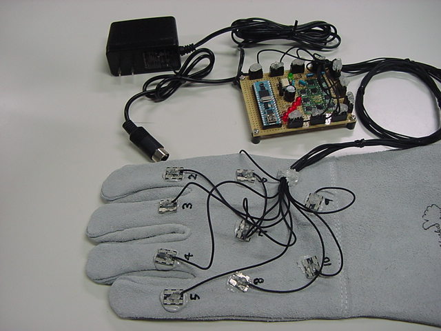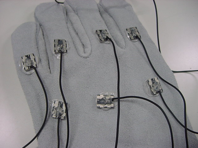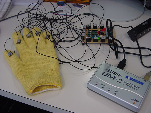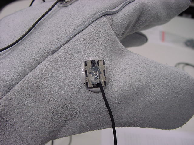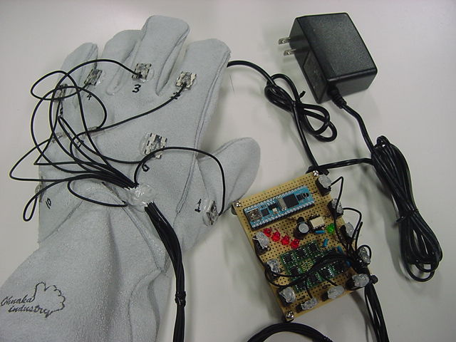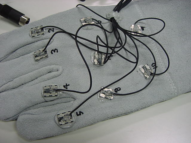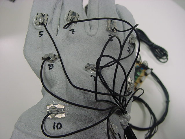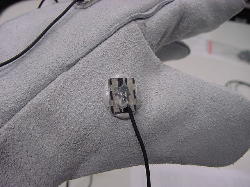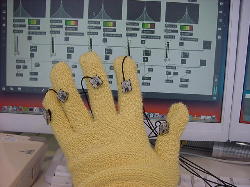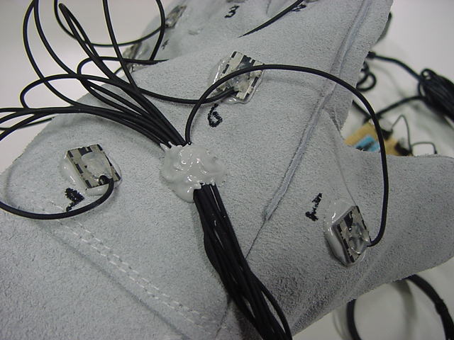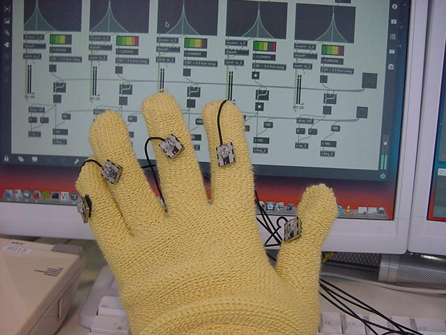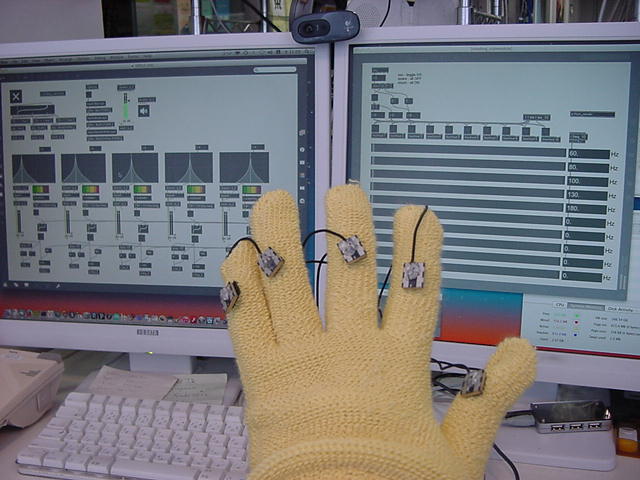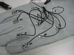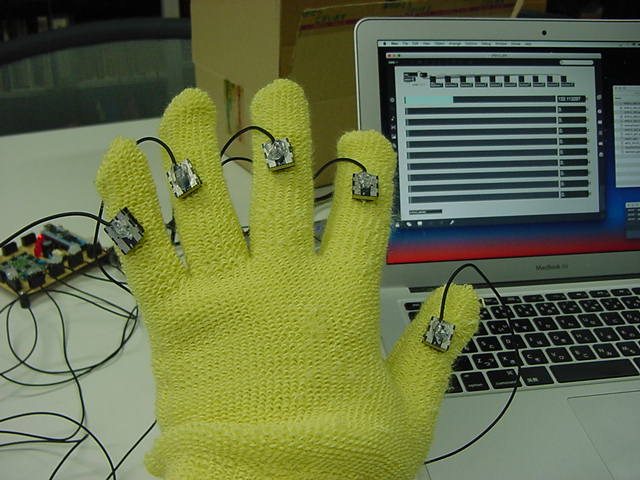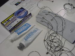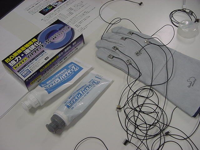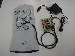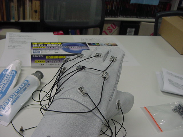・・・そして朝9時から1時間半ほどかけて、ようやく「提示された手順で正しく解決できるかどうか」が解決して、なんとか新学期の冒頭から混乱なく新しいMacで新しいMax7が使える目処がついた。 新学期なんてこんなものだが、さらに新学期に向けたあれこれにつかまって、結局、ハンダ付けに入ることが出来なかった(^_^;)。 唯一、昼休みに以下のように、新しく仕入れた耐熱手袋に、リニア振動アクチュエータを接着してみた。 左手に嵌めてじっと保持しながら、右手で接着剤を混ぜてアクチュエータに塗ってさらに手袋に貼ってデジカメを片手で起動して写真を撮る、というのはなかなか大変だったが、これが出来たらいよいよ、「怪しい振動」の模索プログラミングである。