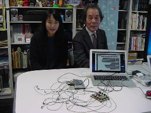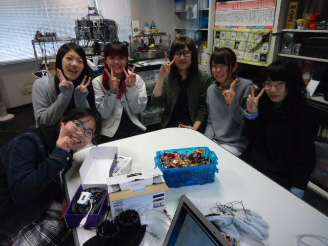 そして午後には、共同研究の打合せで、村尾先生と宮田先生が研究室に来てくれて、実際に村尾先生のお腹に筋電センサを貼って、こんな感じで実験できる・・・というのをディスカッションしたり、いろいろお話できた。