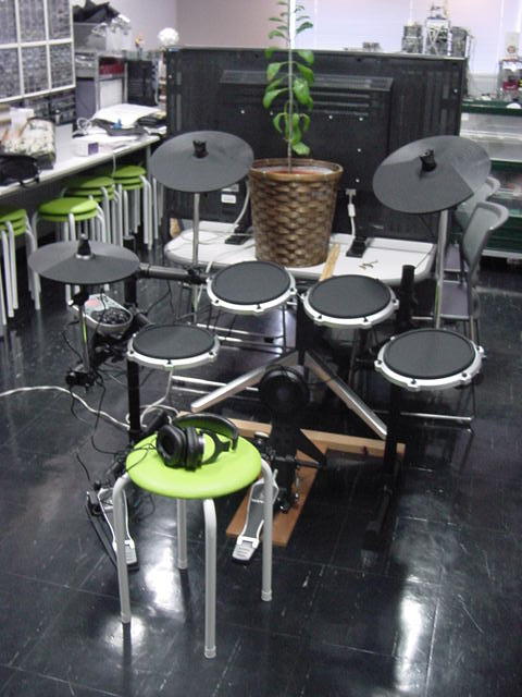 その後、企画立案演習の合間に業者から納品があって、 このように 1106研究室にドラムセットを組み立てた。 ヘッドホンで聞くとなかなか良い音だが、なんせ非常にかさばると判明したので、いつまで鎮座しているかは不明である。(^_^;)