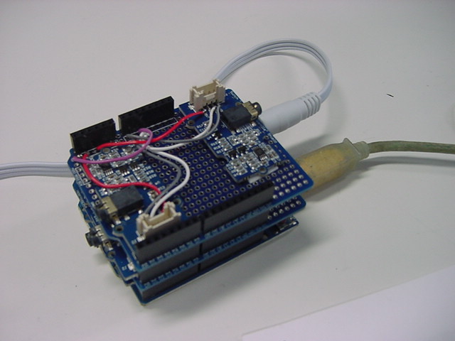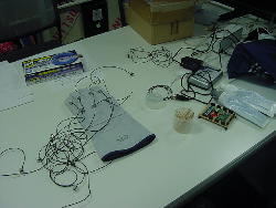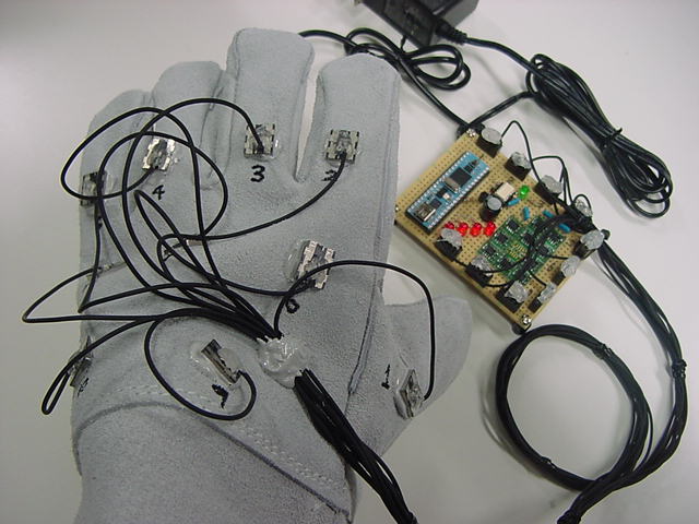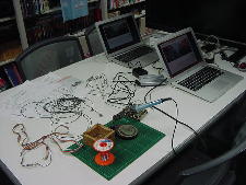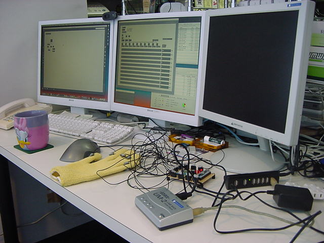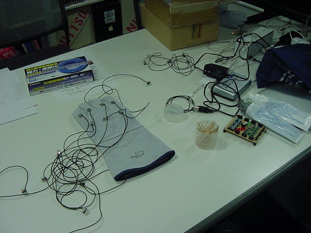 照岡さん情報によれば、複数の振動の周波数を微妙にずらすと平行移動のような面白い感覚がある・・・とのことだったが、今回は耐熱軍手で熱さは感じないものの、リニア振動アクチュエータを取り付けたマジックテープのベース部分のゴムが、連続動作で微妙な臭いを出してきて、ヘタすると溶けてきそうなので、今日はここまでとした。 1日で2つのシステムをそこそこ進めてしまった、というのは、なかなかいい感じである。(^_^)