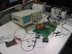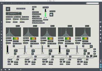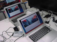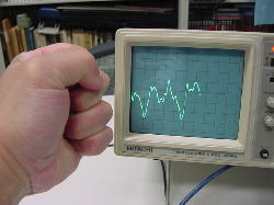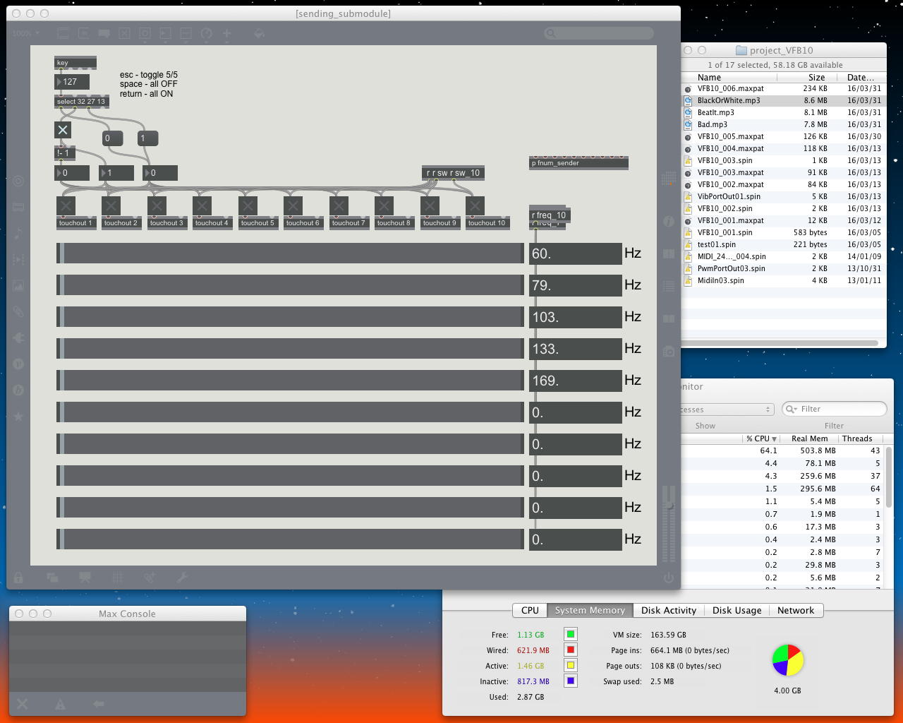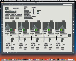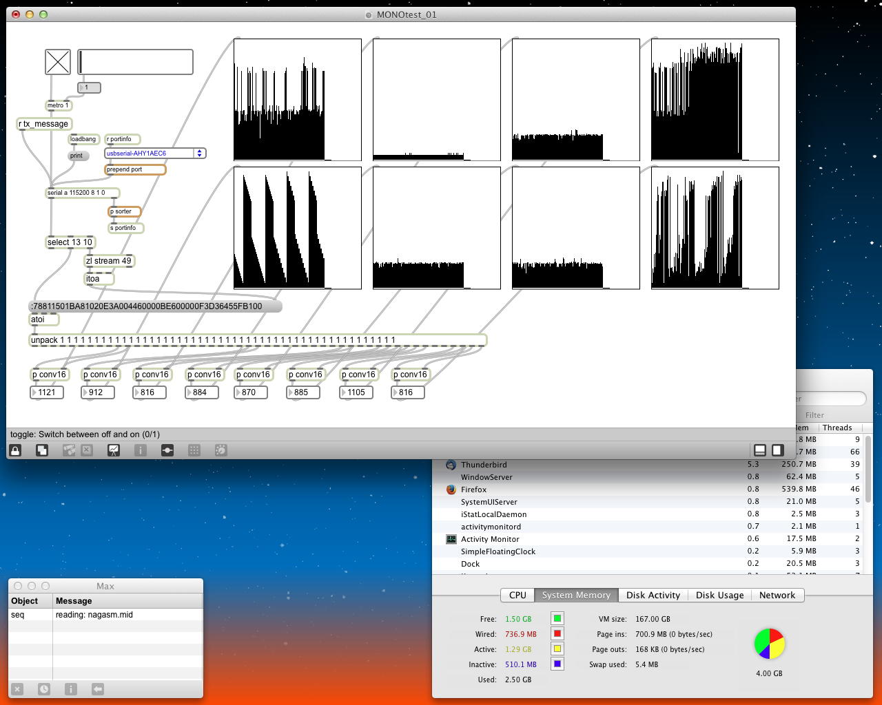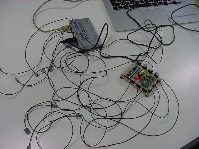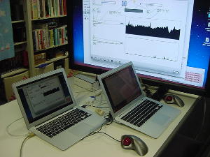 そして午前中、懸案だったリニア振動アクチュエータで「音楽は聞けるのか?」という、音楽情報科学研究会でのネタの最初の実験をしてみた。 まずは上のようにお仕事Macにシステムを繋いだが、これはワークスペースとして2画面が欲しいのと、MSPで多数のディジタルフィルタを並べるぐらいであれば、お仕事用Mac mini(2.26GHz ICore2Duo, 4GBmemory)程度でも十分に動くだろう、という読みからである。