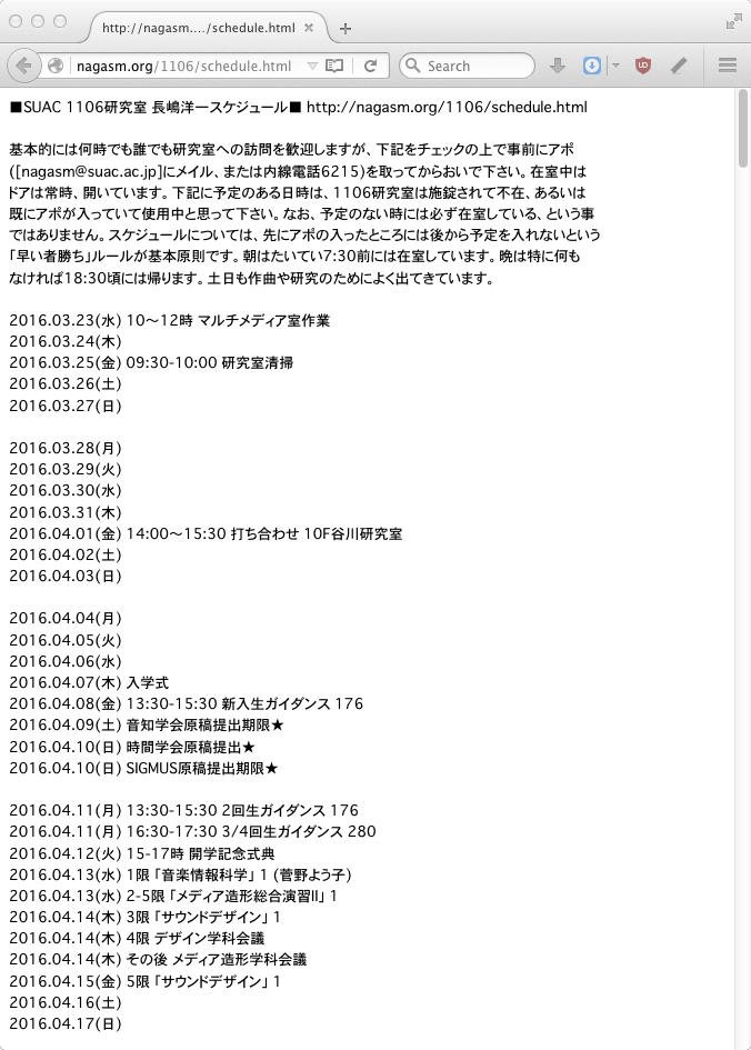 いよいよ、3月もほぼラスト1週間である。 常にWebに上げている僕のスケジュールは、これまでいつもギッシリで出張も多かったが、なんと今月は以下のようにスカスカである。 4月になれば、発表応募した学会の予稿論文提出締切が並び、新学期の準備でもどんどん予定が入ってくるし(僕は入学式でデザイン学科の新入生約114人の呼名も担当)、今月もこれからぼちぼちゼミ生のアポも入ってこないと逆に心配なのだが(^_^;)、このようにスカスカなのはおそらく、1年間でこの時期だけである。