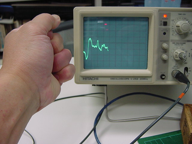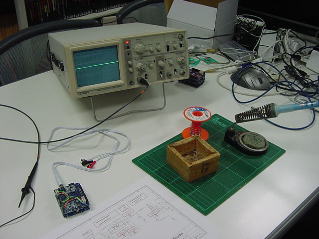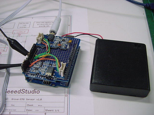 そして午後の後半には、照岡さんから届いた、Seeed社の筋電センサ回路の改良について、上のように実験してみた。 チップ部品を取ったり他の部品に付け替えたりはなかなか大変だが(^_^;)、なんとか出来た。 ArduinoにUSB電源(パソコンでなく+5Vのみを供給するもの)を繋いでも、アルカリ電池に変えても、ハムがある程度は乗ってしまうが、過去に照岡さんと作ってきた歴代の筋電センサと似たような信号が得られた。 ただしこれについては、いよいよ本腰を入れて、基板も起こして、ちゃんとしたものにしていくつもりで、あくまでSeeed社のものは「繋ぎ」である。 なかなかに充実した一日となった。