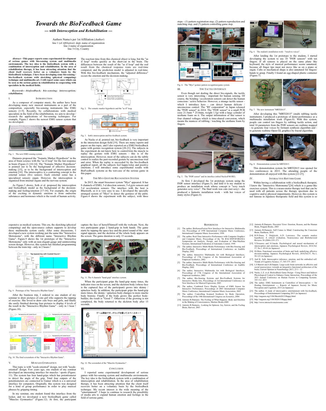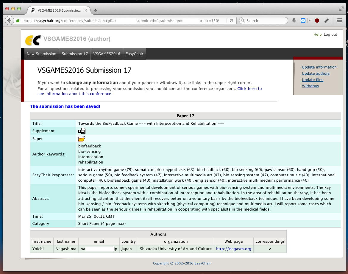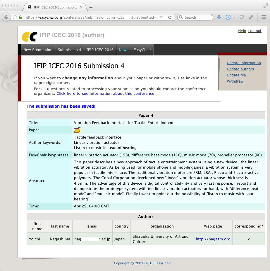 Dear Nathan, On 16/04/29 2:51, Nathan Seidle wrote: > Our product group has looked at your board and has agreed > to work on it. It should be assigned to an engineer shortly. Great !! I am looking forward to your next contact. And if, if possible, please name this board "VPP_SUAC" or "VPP-SUAC" as a nickname adding to your official name. In Japanese research/ multimedia community, the term "VPP" and "SUAC" is very famous/popular in EMG field, so this board will be hit with this nickname in Google/Yahoo, and your sales of this board will be much higher. Best, Yoichi Nagashimaそしてここから午前中、あと1ページ程度に迫っていた ICEC2016 の論文応募を、以下のようになんとかやっつけて送付してしまった(^_^)。 Submission Categoryの選択がメニューになかったが、まぁ4ページで出せばPosterなのだろうか。 これも、まぁやっつけで後のフォローは大変だとしても、なんとなく勝算アリである。