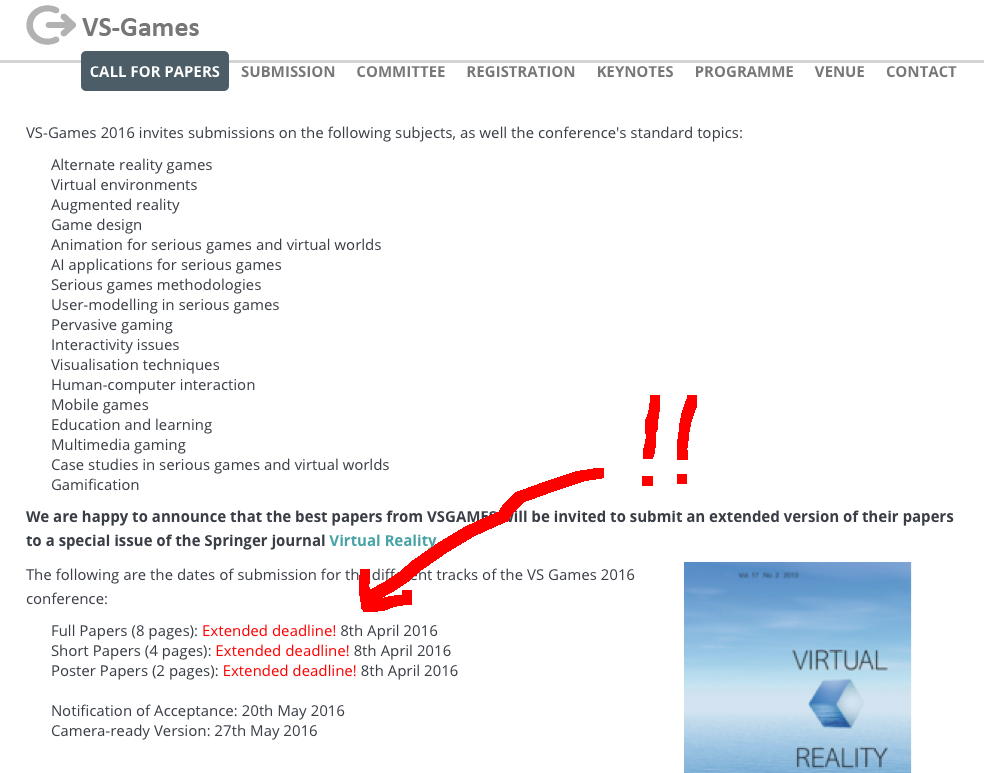 何もない週末である。 今月前半の無理がたたって声帯が痛んでいる・・・という耳鼻科の先生の見立てで、カラオケをググッと堪えた日々が続き、ぼちぼち治ってきたので、そろそろリハビリを欲してきているが、この週末はストイックに過ごすのだ。 そして、昨日が応募期限であった VS-Games2016 のCall for PapersのWebサイトに行ってみると、案の定、締め切りが延長されていた(^_^;)。 当日の僕の応募にNO.17が付くようでは、おそらくここから駆け込み応募が来ても、100件とか150件程度だろうから、僕のpaperが採択される可能性もちょっとはある、という朗報である。