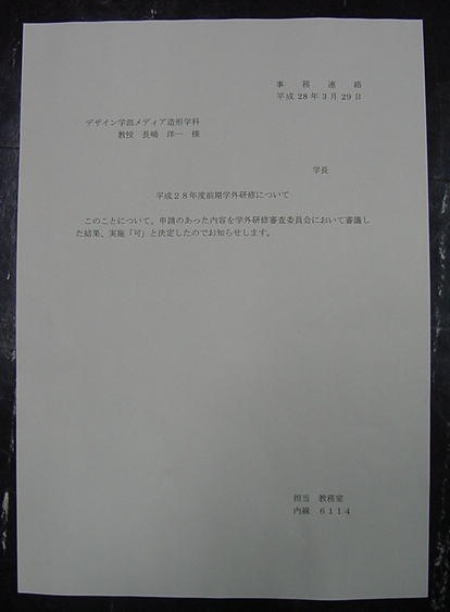 ・・・と盛り上がっていたところに午後2時過ぎ、今度は教務室からメイルが届いた。 以下のように淡白なメイルで、事務局に通知を取りにいってみると、上のようにさらに淡白だった(^_^;)が、とにかく、これで正式に、この夏の欧露ツアーが確定したのだ(^_^)。