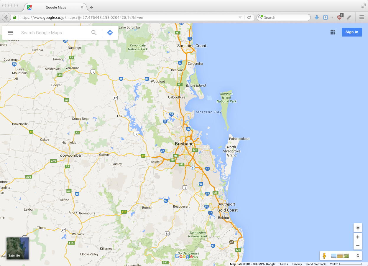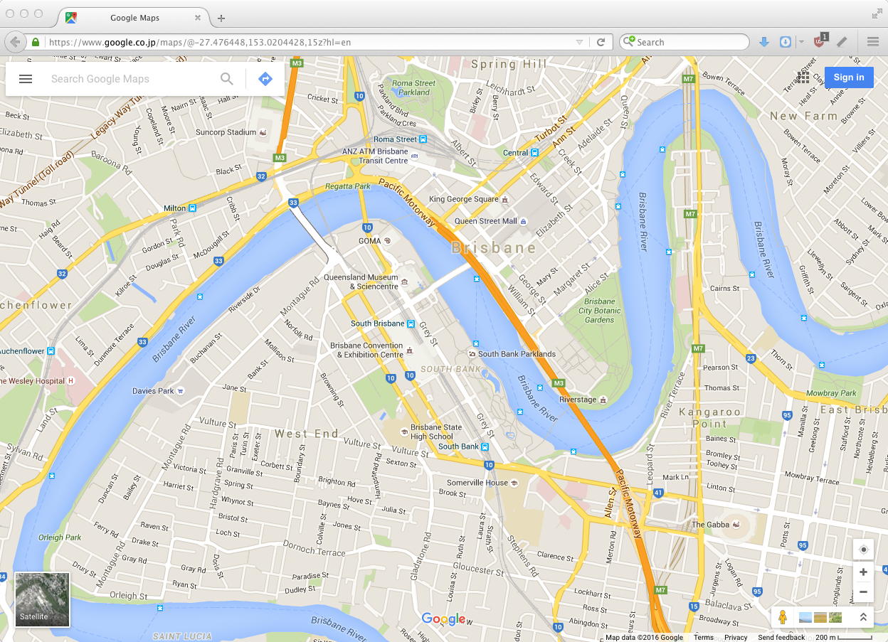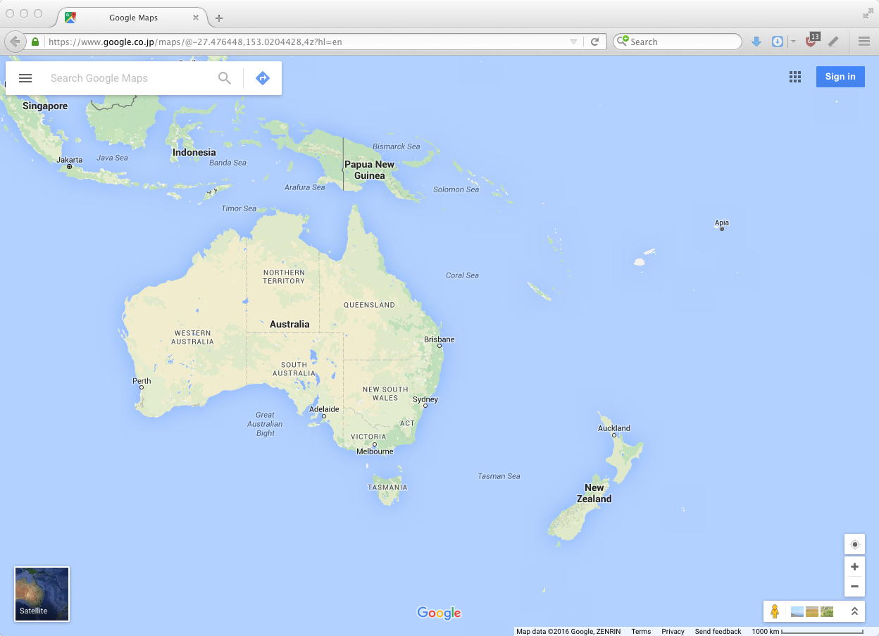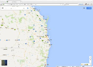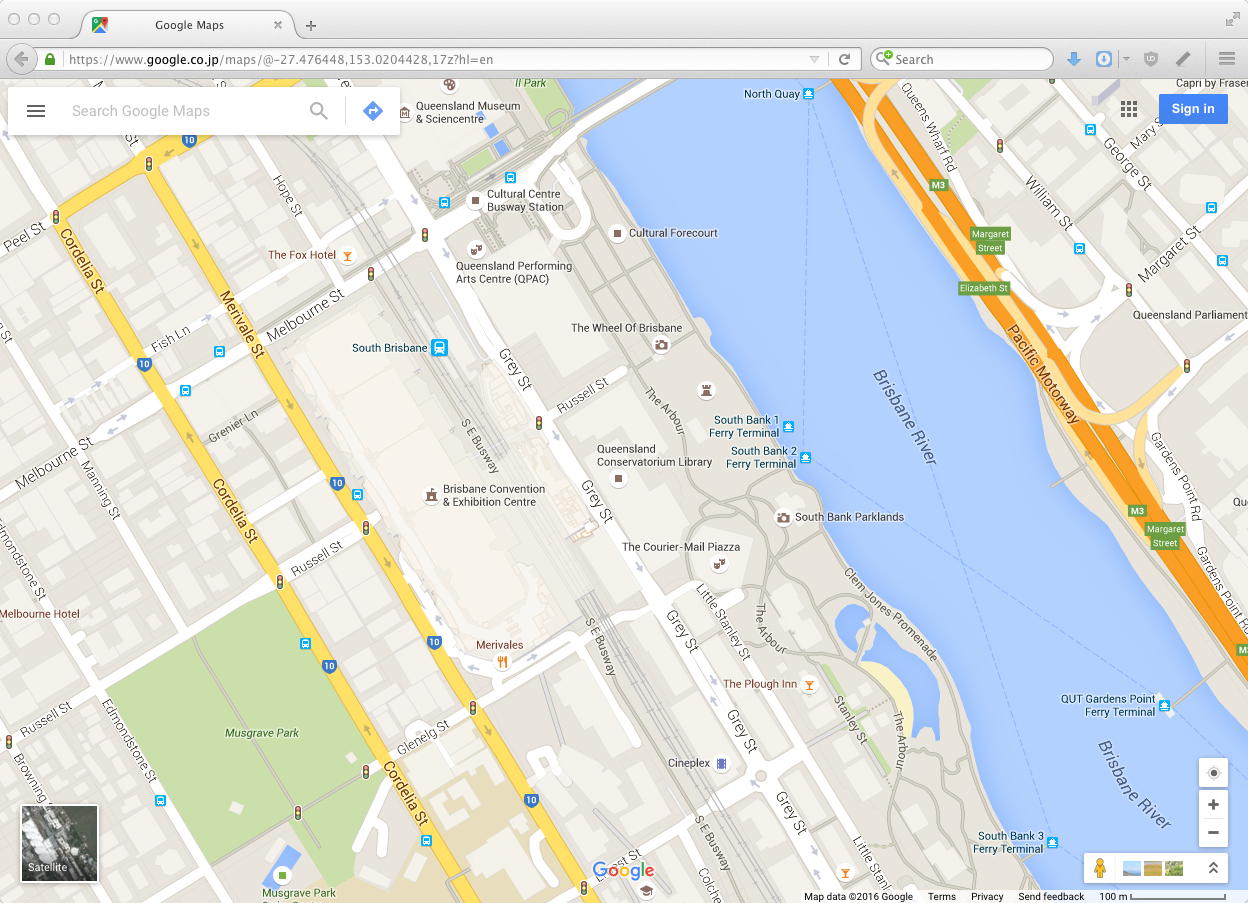 そして、引き続き NIME2016のページ で、NIMEが開催される会場だという、 Queensland Conservatorium の マップPDF をゲットしつつ、「South Bank Brisbane」とGoogleマップで検索した地図で、川のほとりの会場を確認した。 以下はそのGoogleマップの中央に会場のQueensland Conservatoriumを据えて、どんどんどんどんズームアウトしていった画面を逆順に並べたものである。 つまり日本が画面に入っていてオーストラリアの全体も入っているマップから、14回ズームインしたのが最後のマップである。 オーストラリアの全域が入る2番目のマップからBrisbaneは載っている、さすが第3の都市なのだが、なんともいい時代だぁ。(^_^)