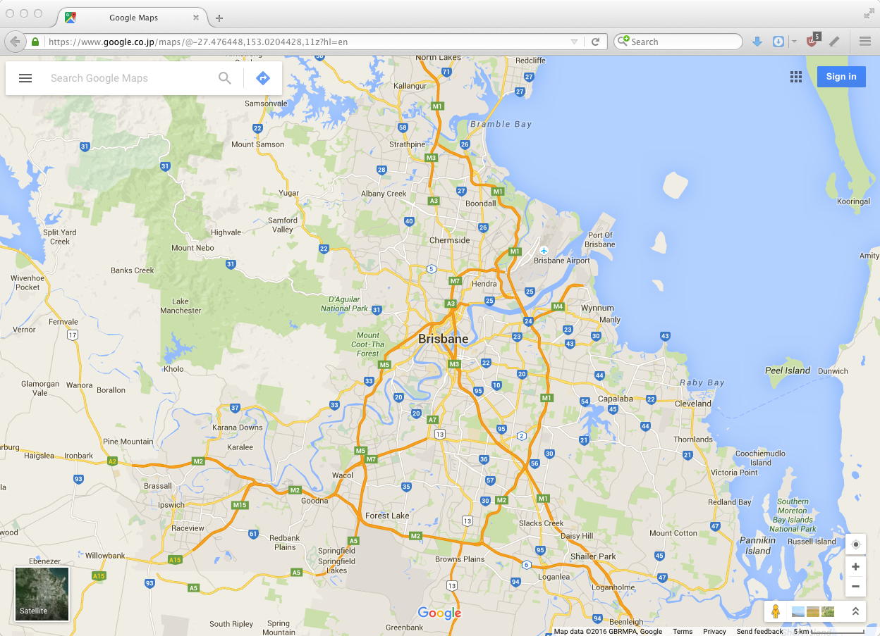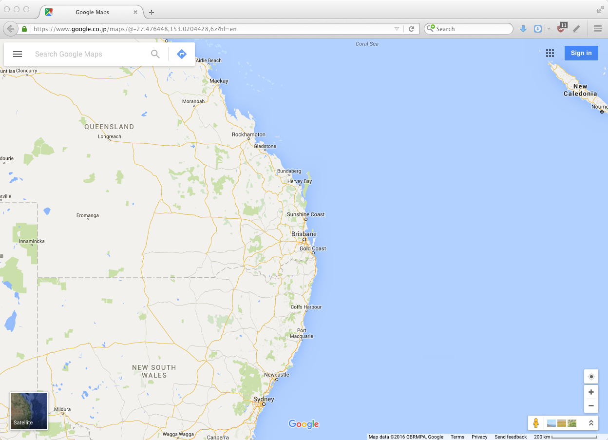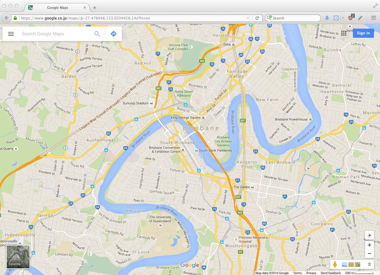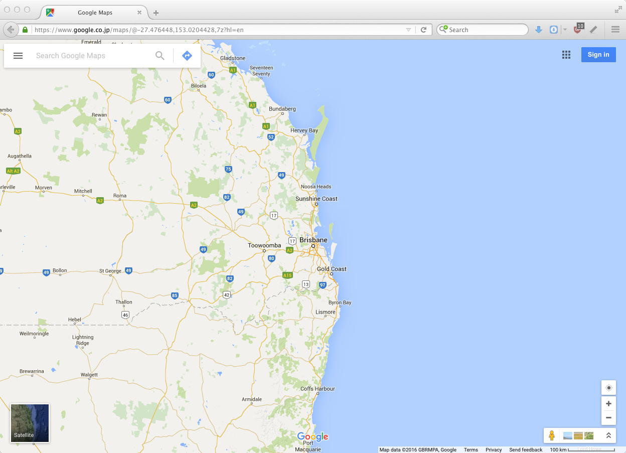 そして、引き続き NIME2016のページ で、NIMEが開催される会場だという、 Queensland Conservatorium の マップPDF をゲットしつつ、「South Bank Brisbane」とGoogleマップで検索した地図で、川のほとりの会場を確認した。 以下はそのGoogleマップの中央に会場のQueensland Conservatoriumを据えて、どんどんどんどんズームアウトしていった画面を逆順に並べたものである。 つまり日本が画面に入っていてオーストラリアの全体も入っているマップから、14回ズームインしたのが最後のマップである。 オーストラリアの全域が入る2番目のマップからBrisbaneは載っている、さすが第3の都市なのだが、なんともいい時代だぁ。(^_^)