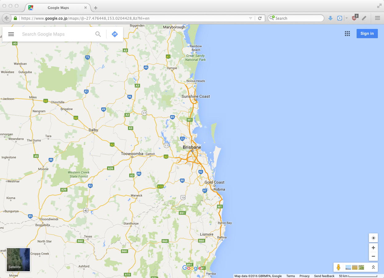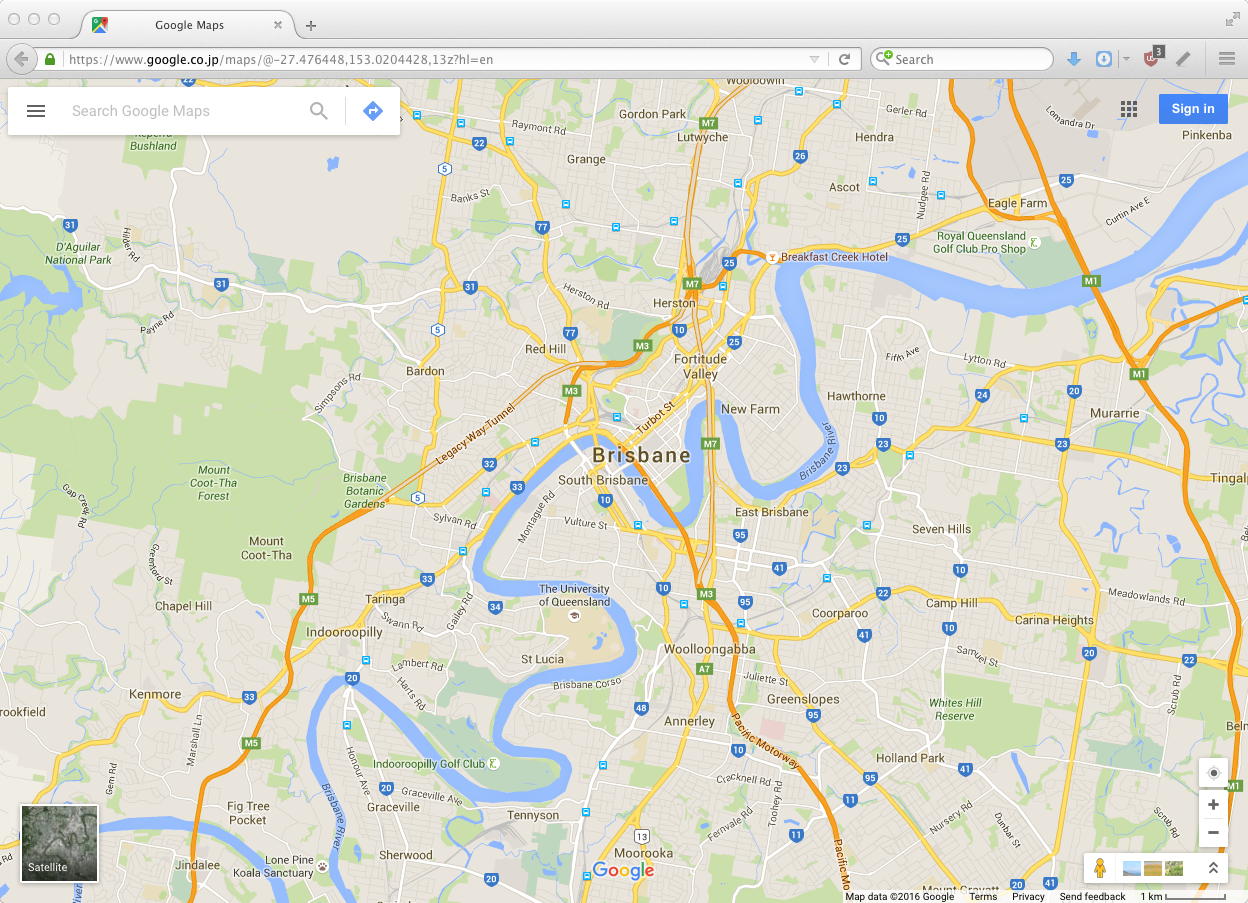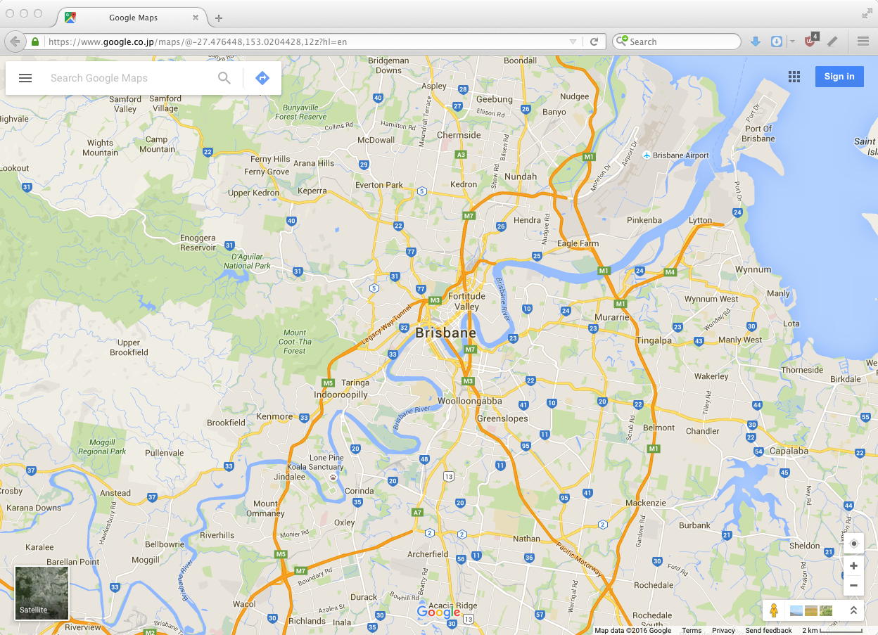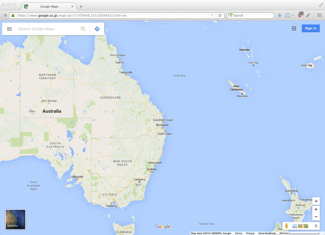 そして、引き続き NIME2016のページ で、NIMEが開催される会場だという、 Queensland Conservatorium の マップPDF をゲットしつつ、「South Bank Brisbane」とGoogleマップで検索した地図で、川のほとりの会場を確認した。 以下はそのGoogleマップの中央に会場のQueensland Conservatoriumを据えて、どんどんどんどんズームアウトしていった画面を逆順に並べたものである。 つまり日本が画面に入っていてオーストラリアの全体も入っているマップから、14回ズームインしたのが最後のマップである。 オーストラリアの全域が入る2番目のマップからBrisbaneは載っている、さすが第3の都市なのだが、なんともいい時代だぁ。(^_^)