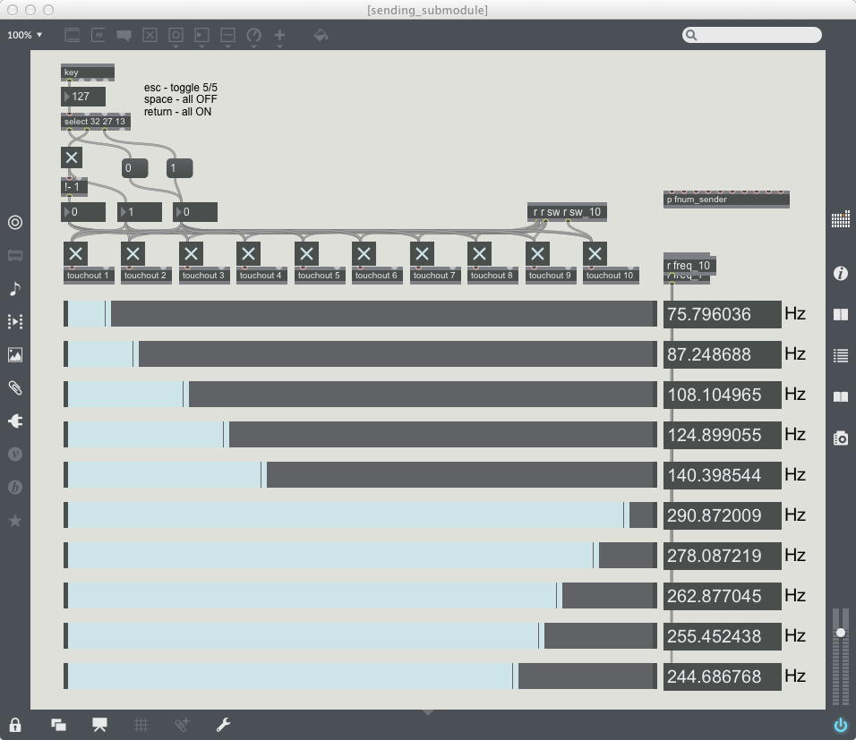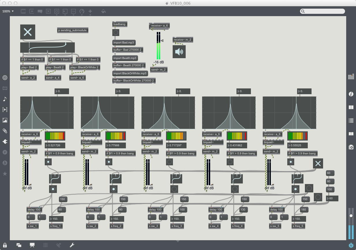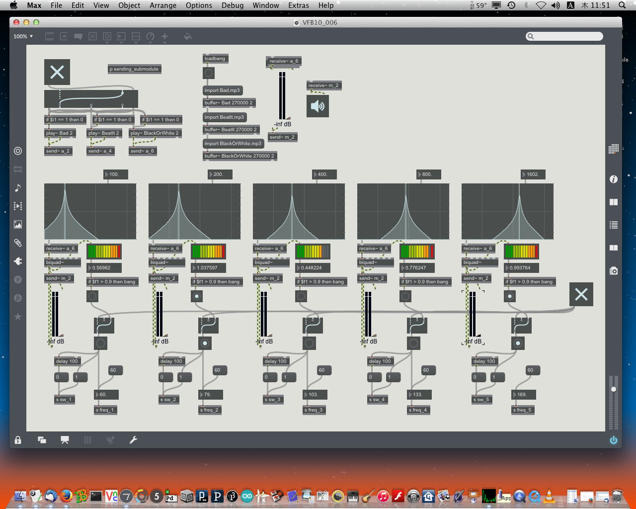 そして2時間ちょっとで、以下のようにサウンド素材としてMichael Jacksonの3つの曲をYouTubeから落としてトリミングしてAIFF→MP3化して、5バンド(100Hz,200Hz,400Hz,800Hz,1600Hz - Q=11.2)のBPFで帯域分割してそれぞれのピーク時に100msecのdurationでそれぞれ適当に変えた周波数(60Hz,80Hz,100Hz,130Hz,180Hz - 敢えてpeakの150Hzを外す)でリニア振動アクチュエータをドライブする、という実験ソフトを完成した。 一応 YouTube にも上げてみた(アップロード完了日時は3/31の12:49)が、これは怒られる可能性がとても高い(^_^;)のでmp4(71MB)も置いておくと、 こんな感じ になった。 なかなかそれっぽいのではないだろうか。