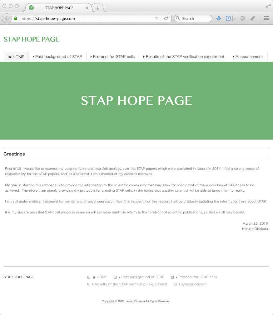 昨日の夕方、以下のような「STAP細胞の作り方」という英語のサイトが出来た、というニュースで実際にそのページを見てみた(英語でOBOKATA氏が説明していた)のだが、その「http://stap-hope-page.com/」というページは、今日になったら「The web service to this account has been limited temporarily!」となっていて、アッサリ消えていた(^_^;)。 エイプリルフールもフライングの時代らしい。