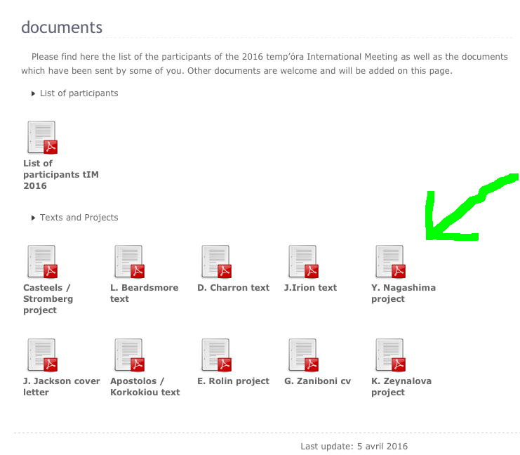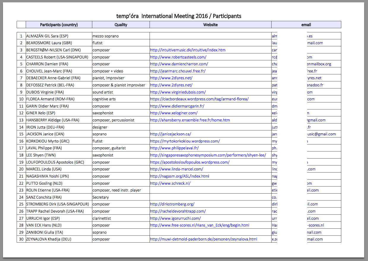 そして今朝、届いていたメイルはたった1本だったが、8-9月の欧露ツアーの冒頭で参加する、tempora2016の主催者のDidier Marc GARIN氏からの案内で、今年の参加者が上のようになった、というものだった。 日本人は僕一人、望むところである。 指定されたパスワードでログイン出来なかった(^_^;)ので問合せを出したので詳細は今後だが、メンバー同士でプロジェクトを企画して「何かをする」というものである。 おいおい様子を見ていこう。 さらに上のメンバーリストで、僕の名前の綴りが間違っているのも発覚した(^_^;)ので、別メイルで知らせておいた。