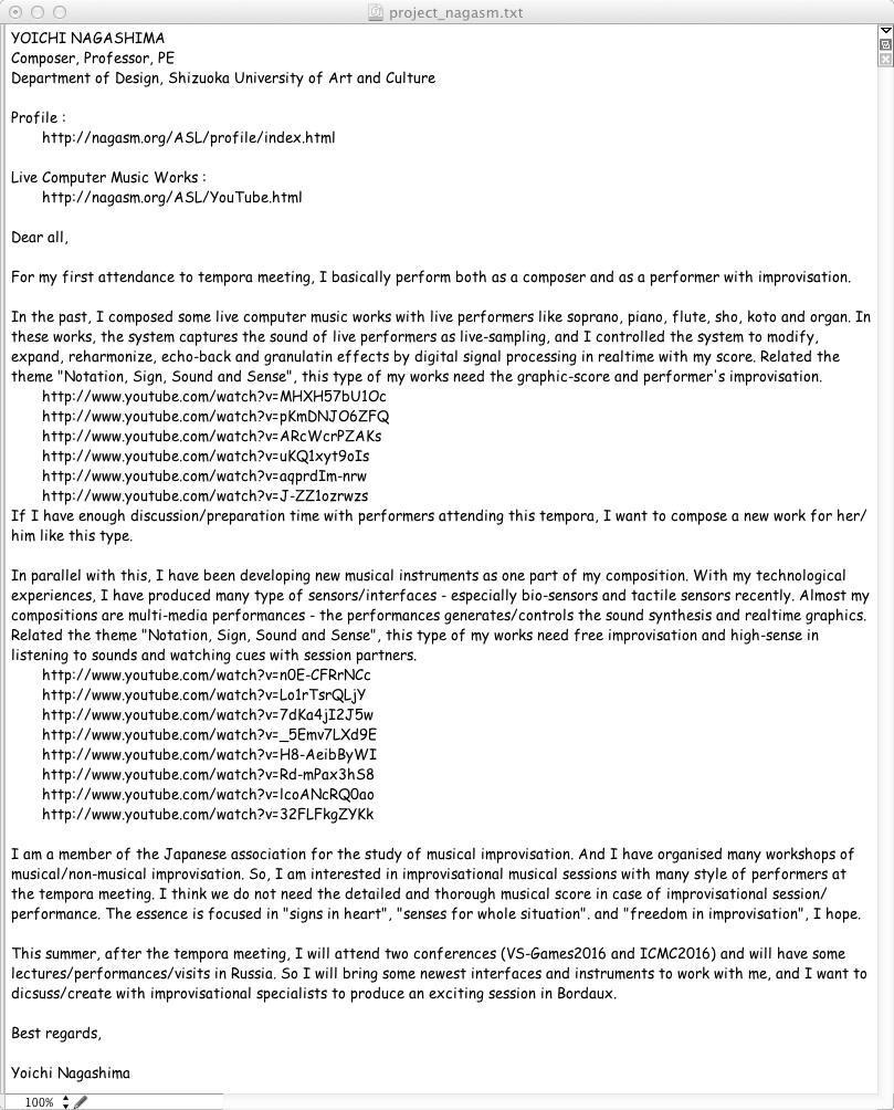 temporaのログイン問題は無事に解決して、上のように参加者の一部のプロジェクト・ドキュメントが置かれていた。 まずはこれを書かなければいけないが、フランス人がフランス語で書いた文書をGoogle翻訳で日本語にして解釈すると、だいぶ話が逸れているような気がする。 まったく忘れていたが、主催者は募集にあたって「For this meeting, the theme "Notation, Sign, Sound and Sense" is proposed. With their registration form, candidates are then invited to send a short presentation of an artistic project evoking this theme or not.」と告知していたのだった。 基本的にはオリジナル楽器で即興セッションに参加すれば何とかなる、という受け皿はあるものの、せっかくなのでここまでの9件(11人)のプロジェクト・ドキュメントを読んで、他の参加者が興味をもってくれるようなドキュメントを作ってみることにした。 業者からは秋月電子から購入したパーツも納品されていて、そちらも後ろ髪なのだが、まずは今日は「英語の作文」、と決めた。
