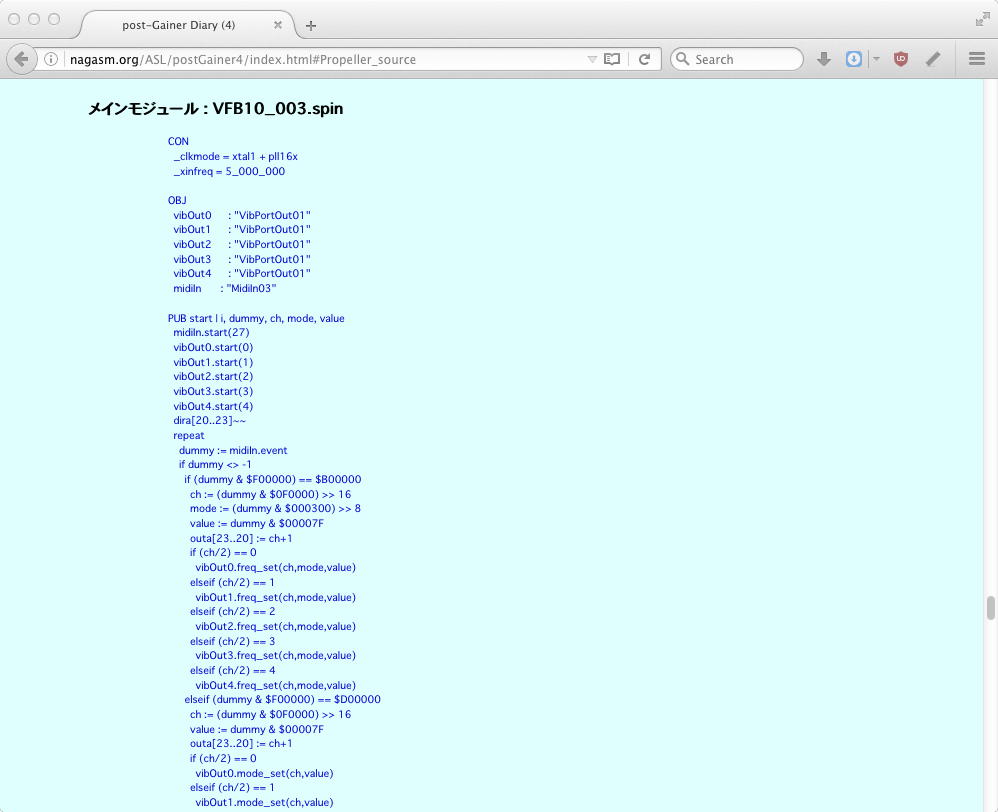 昨日からの「春の嵐」も過ぎ去って、春らしい好天となった。 せっかくの入学式が雨となった新入生には気の毒だが、こういう時はたぶん偉い人は「雨降って地固まる」とか言うんだろうなぁ。 午後に新入生ガイダンスがあるだけのこの日は、一気に音楽情報科学研究会の予稿をやっつける気満々で研究室に出て来た。 まず最初に、今回のシステムの製作のあたりを記述していた postGainer日記(4) に2ヶ所、 ここ と ここ にNAMEタグを設置した。 これを予稿のReferenceに書いておけば、後で以下のようにPropellerのメイキングとソースプログラムが検索できるのである。