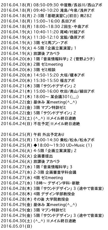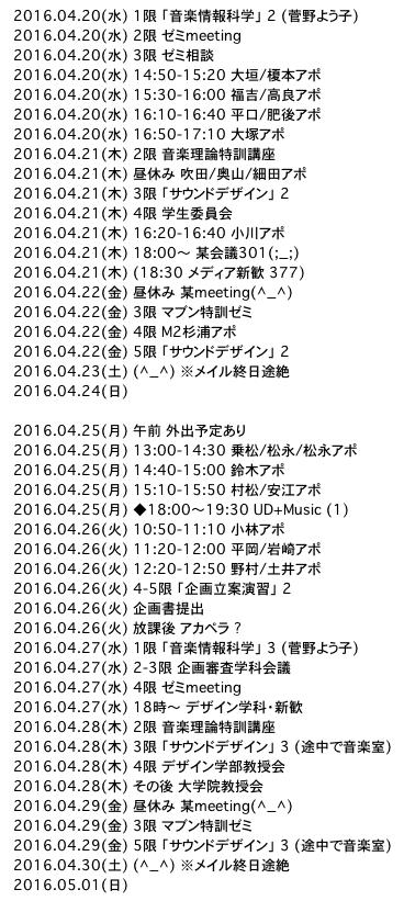 朝6時半から研究室に出て来て、新学期もいよいよ第2週に入るが、まだ月・火は講義初日であり、履修登録期間である。 先週までに面談した新入生は44人と、まだ全体の39%であり、以下のように今週と来週にも続々とアポが入ってきている。 僕が常に世界に公開している スケジュール で、1週間の項目がこれだけ多いのはたぶん、前例がないように思う。 土曜日には第1陣として新入生3人(+2回生1人)と9時間マラソンカラオケで29曲、これはあと3週、続く予定である。 昨日の日曜には、講義初日の準備を2科目と、卒展あたりから滞っていた教材動画の整理とバックアップ(数十本、計8GBほどのmp4)をしていたら終わり、またまた研究開発のようなところまで進まなかった。