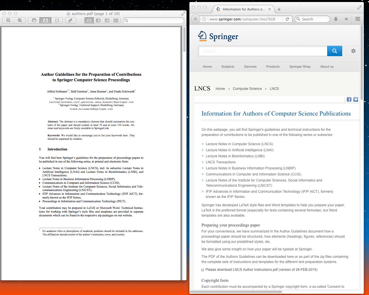 そして、上のようにICEC2016のcall for paperページから飛ばされたSpringerのサイトで落としたテンプレートから、これは結構、タイヘンであるという事実が判明した。 IEEEやACMの論文のテンプレートは、Word版を落としてMacのPagesでインポートすれば、最終的になんとかPDFで受け入れられる論文を作れたが、ここのWordテンプレート(2011と2003)は中身が空っぽで、サンプルのPDFをコピペで流し込んだところ、上のように「まったく似ても似つかない」姿となった(^_^;)。