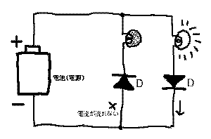電源には図のようにプラスとマイナスの極性があり、豆電球を経由して、