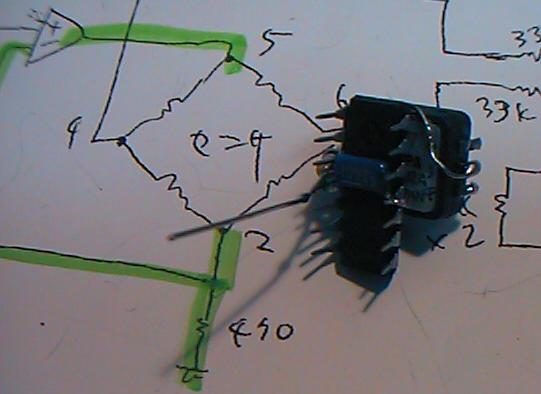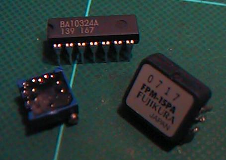 笙奏者/作曲家の東野珠実さんのための笙ブレスセンサのワイヤレス版を 作りました。ここでは、実際の製作の模様を実況します。参考にして下さい。 笙の場合には、息を吹き込む方向と、息を吸う方向と、両方で鳴りますので、 ブレスセンサとしては両方向のセンシングが必須です。 そこで便利なのが、 この 秋月電子の「気圧センサ」モジュールです。 これはどうやら、エアコンに内蔵されている気圧センシングのモジュール のようで、 基板裏面 にあるOKIの1チップマイコンが管理しているのですが、秋月電子では、 このマイコンの部分は無視して(^_^;)、マイコンのA/D入力に 行っている電圧だけを取り出すためにこのキットを売っています。 これ がその心臓部、フジクラの半導体気圧センサです。 半導体チップ上にブリッジ抵抗を構成して、圧力によるチップの変形を検出するものです。 この基板はかなり小型のものですが、そのまま笙に取り付けるのは無理なので、 こうして 基板からセンサを取り外します。オフセット調整用に、1Kのトリマも一つだけ取ります。 センサ部分で使う主な部品は、 この 三つです。基板から取り外した圧力センサ、1Kのポテンショントリマ、そして OPアンプとして324です。基板上の324はミニフラットで加工しにくい ので、通常のDIPを使います。真空管時代のラグ板の感覚でこれを使います。(^_^;)