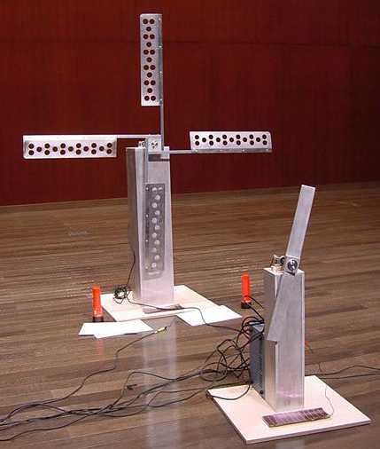 参加形態としては、「造形作品を用いたパフォーマンス」という形の公演となった。これはメディアアートとしては、ある意味ではインスタレーション、ある意味では自然の状況を受け(光に反応)、そして「演奏時間」を持つ音楽(パフォーマンス)作品、でもある、という欲張った構想である。