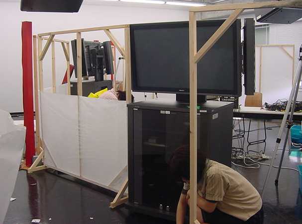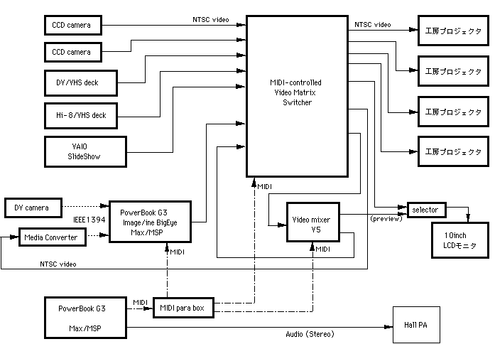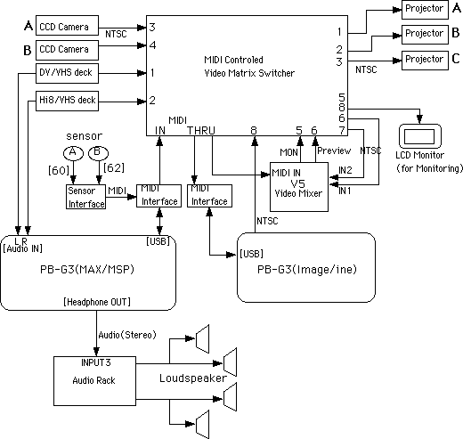 このシステムを前提として、[赤坂知也+平野砂峰旅]氏にサンプルとなるメディア・インスタレーション作品の制作を委嘱した。この完成した委託作品 "CutOut" は2001年5月27日のSUAC一般公開デーにおいて発表披露された。図49はこの作品のシステムブロック図である。