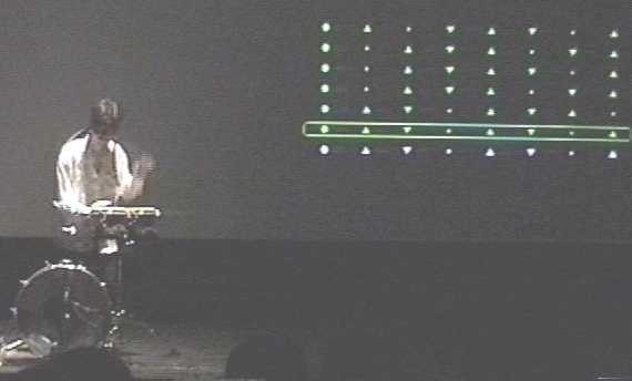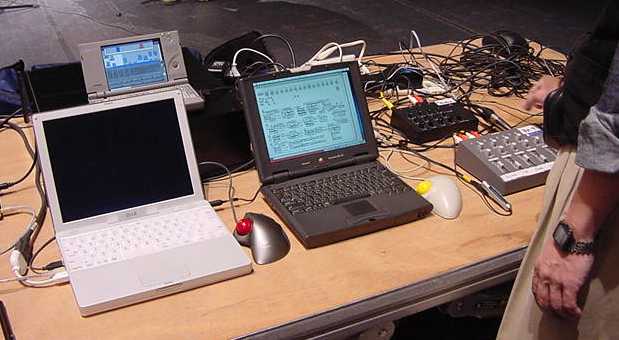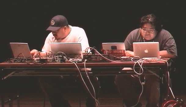 インターネット越しに海外とライブセッションを行う計画だったが、ネットワークの制約のため、ステージ上で2人が4台のノートパソコンをLANで結んでライブ演奏した。