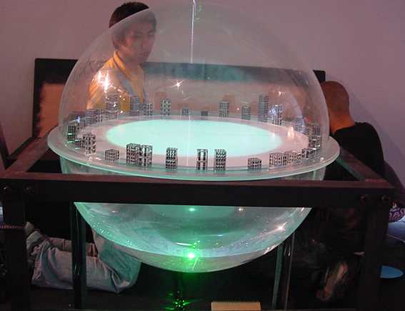 球体の水槽の下からプロジェクタの光を投射して幻想的な「動くオブジェ」を実現した。
