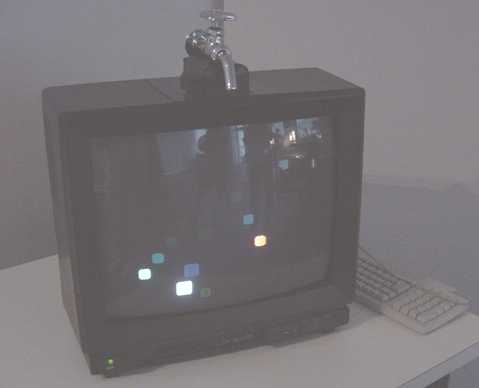 ディスプレイの上に置かれた「蛇口」(センサ)をひねると画面内の光のしずくが落ちる、という作品。