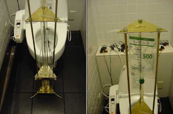 通常はトイレである空間を展示スペースとして、点滴により暗闇で蛍光物質が光り、ピアノ線がサウンドを奏でる。