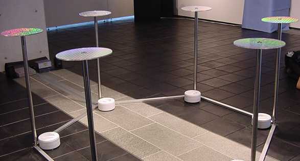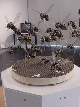 円形テーブル上の多数の「蜂」は、来場者が近付いた方向をセンシングして一斉にその方向を向いて羽音を響かせる。