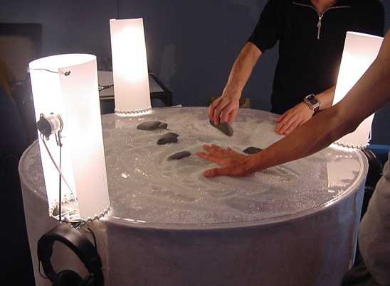 「箱庭」のように砂と砂利を置き、これを来場者が手でこね回す動作をセンシングしてサウンドを生成する。